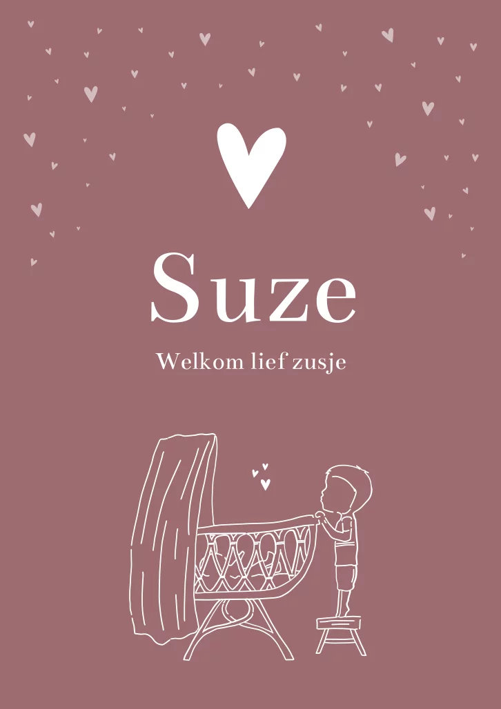 Een romantisch oudroze geboortekaartje met een lijntekening van een grote broer die op zijn teentjes over het randje van de wieg kijkt naar zijn kleine baby zusje. Wil je kaartje Suze graag aanpassen zodat het past bij jullie gezinssituatie? Neem dan een kijkje in onze editor voor alle opties.