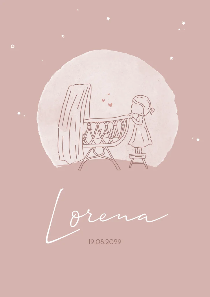 Een beige geboortekaartje in roze tinten.Op kaartje Lorena is een lijntekening van een grote zus te zien die op haar teentjes over het randje van de wieg kijkt. De liefde spat er vanaf d.m.v. hartjes boven het ledikantje. Ziet jouw gezin er anders uit? In onze beeldbank kun je veel meer soorten lijntekeningen vinden.
