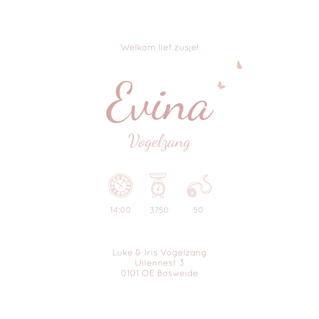 Een lief zacht beige babykaartje met een silhouet illustratie van een kat en een poes die in het wiegje kijken. De accent kleuren zijn zachte roze tinten. Er vliegen vlinders en vogels bij de boom. En er staan bloemetjes bij het babybedje. Kaartje Evina kan je eenvoudig zelf aanpassen in onze editor!