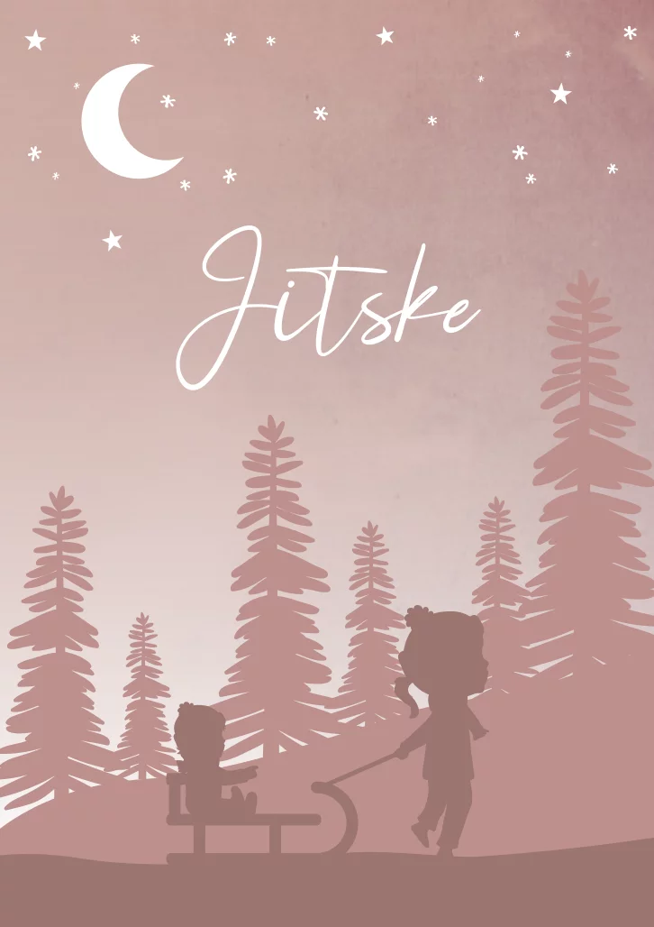 Een roze geboortekaartje met een winterse uitstraling. Op kaartje Jitske zijn twee zusjes afgebeeld met een slee lopend in een winters bos onder een heldere sterrenhemel en maan.