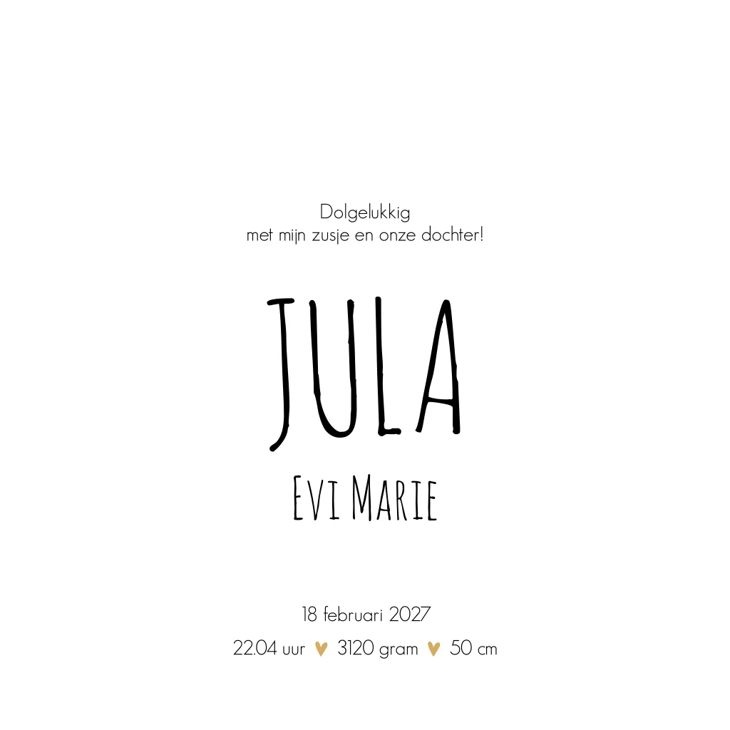 Een wit geboortekaartje met gouden hartjes en sterretjes. Kaartje Jula is daardoor eenvoudig maar de goudfolie maakt het een speciaal kaartje.