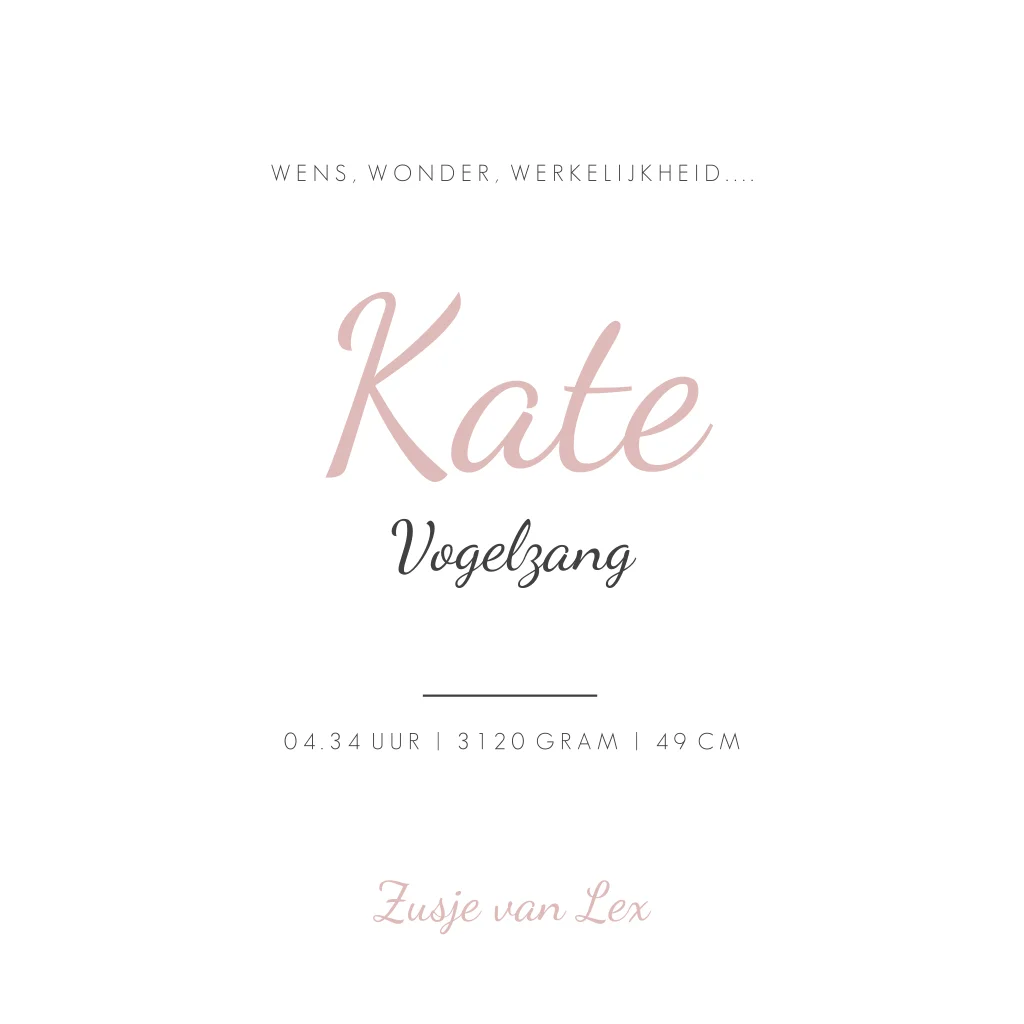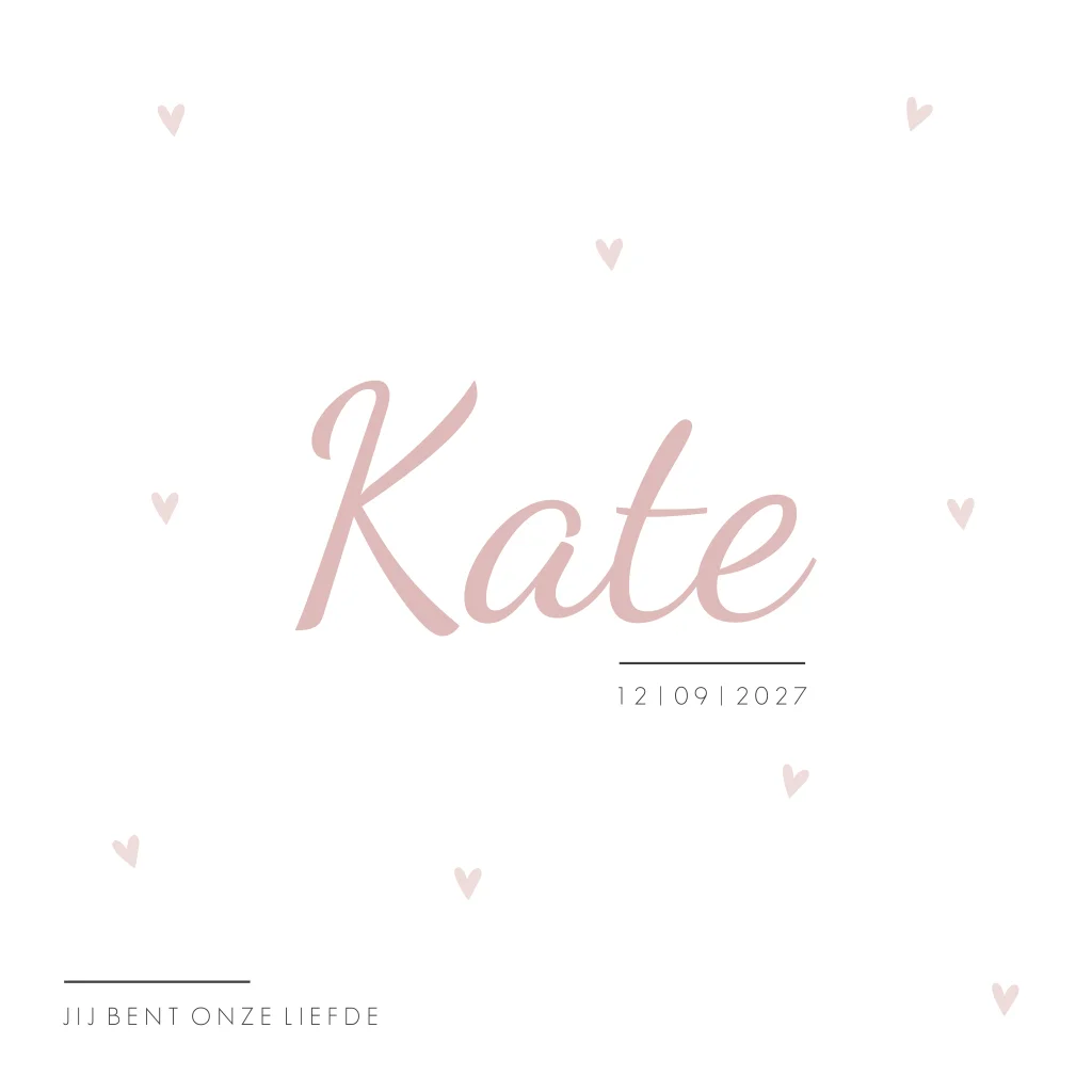 Een wit geboortekaartje met hartjes. De roze kleur geeft kaartje Kate een lieve uitstraling.