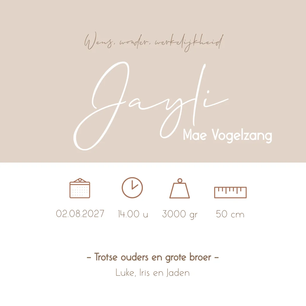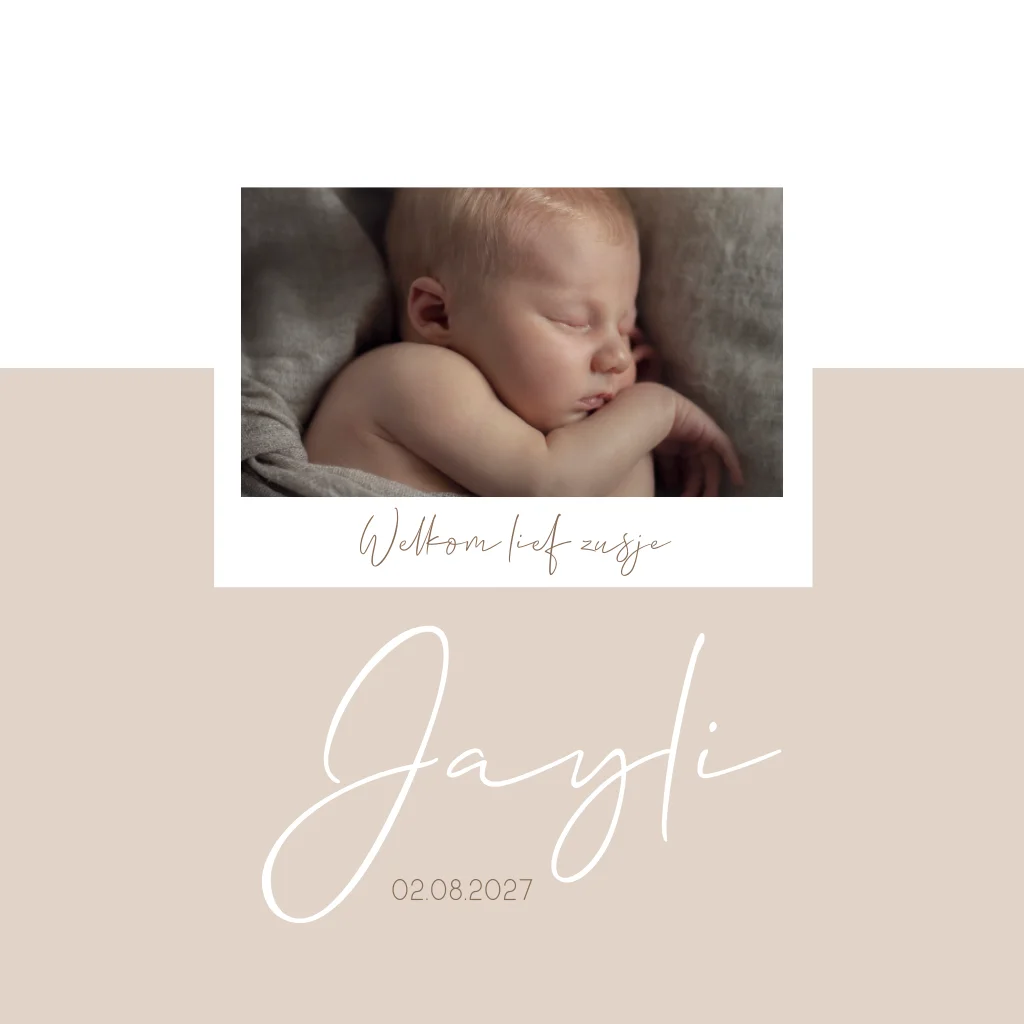 Zalm roze geboorte kaartje met babyfoto en witte sierlijke letters en bruine details. Pas geboortekaartje Jayli naar eigen wens aan in de editor.