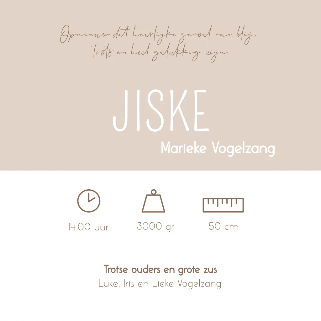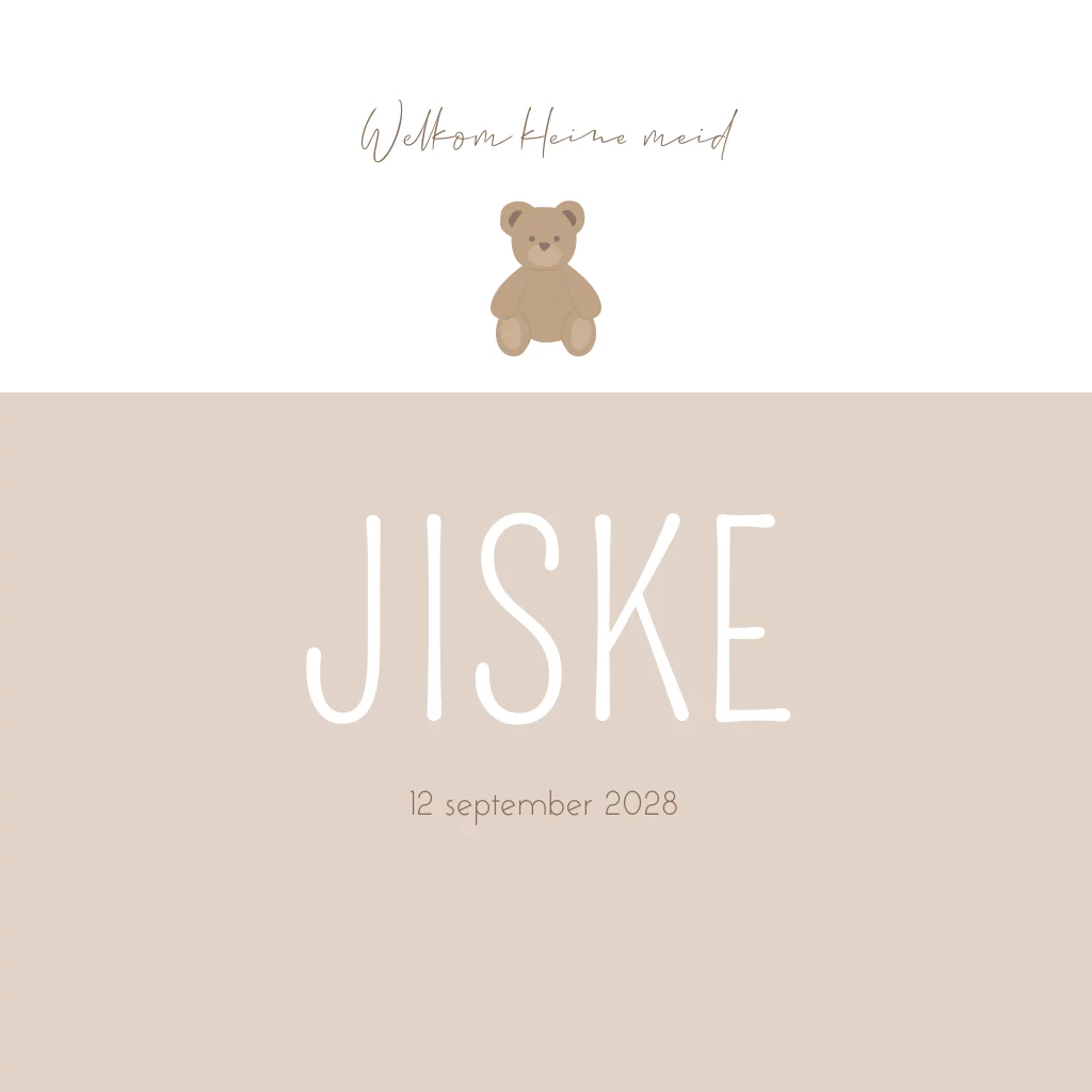 Zalm roze geboorte kaartje Jiske met teddy beertje en witte letters voor de naam. Aan de binnenkant staat een lijntekening van 2 zusjes die elkaar om armen. Pas dit geboortekaartje naar eigen wens aan in de editor.