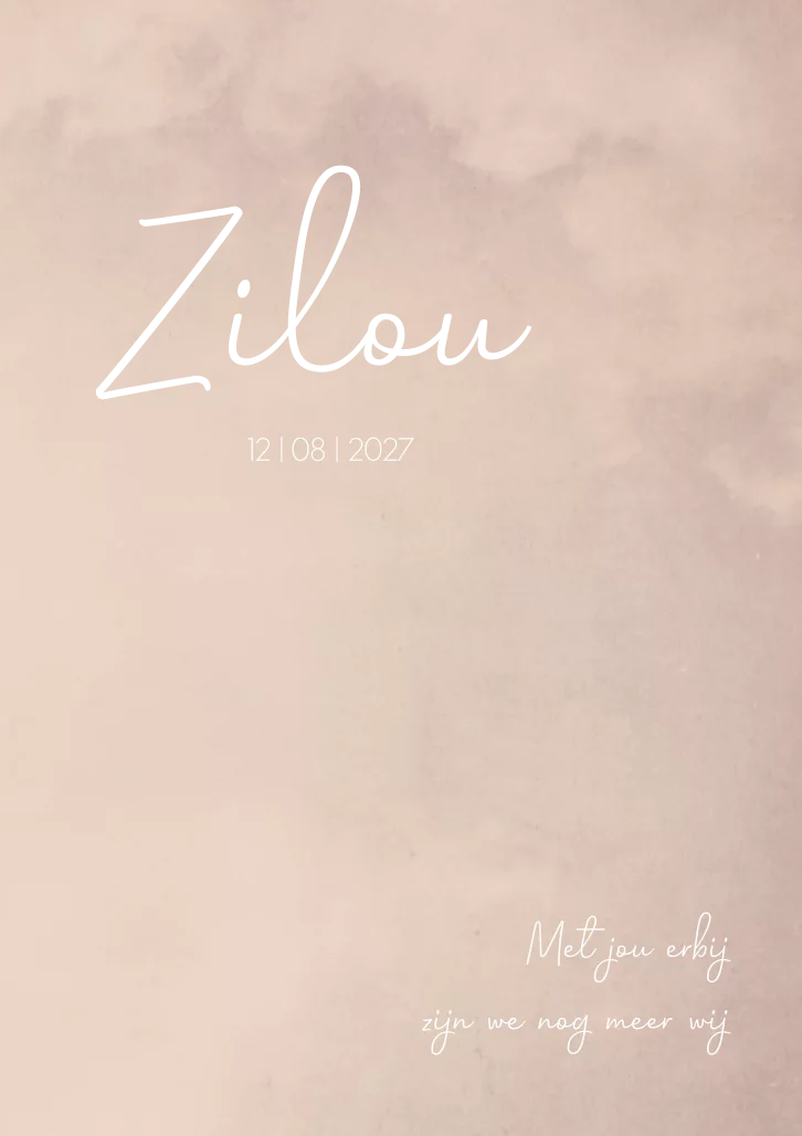 Warm zalmroze peach gewolkt geboortekaartje met koperfolie letters voor de naam. Kaartje Zilou is door de speelse indeling op de achterzijde een bijzonder kaartje!