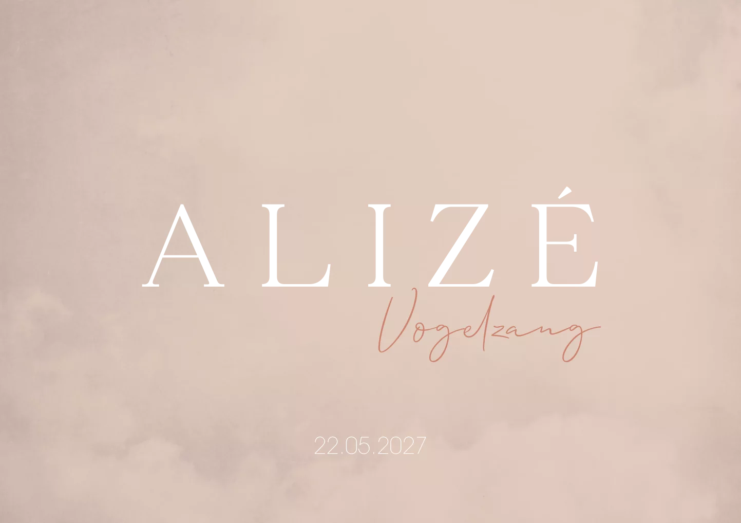 Supermooi en strak zalm roze/ peach gewolkt geboortekaartje Alizé met chique letters in goudfolie en sierlijke letters voor de achternaam. Pas de kaart aan naar jouw wensen en maak de kaart helemaal eigen in onze editor!