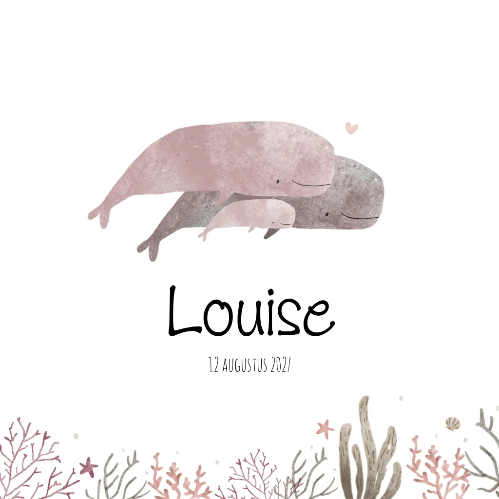 Een wit geboortekaartje met een onderwaterwereld in waterverfstijl. Op de voorzijde van kaartje Louise zijn drie walvissen te zien omringd door koraal, zeesterren en schelpjes. Een lief kaartje voor alle zee-liefhebbers.