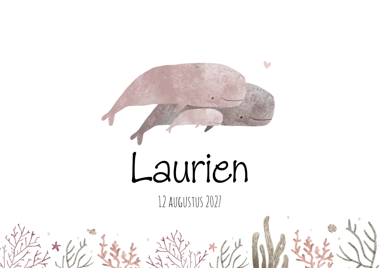 Een wit geboortekaartje met een onderwaterwereld in waterverfstijl. Op de voorzijde van kaartje Laurien zijn drie walvissen te zien omringd door koraal, zeesterren en schelpjes. Een lief kaartje in roze tinten voor alle zee-liefhebbers.