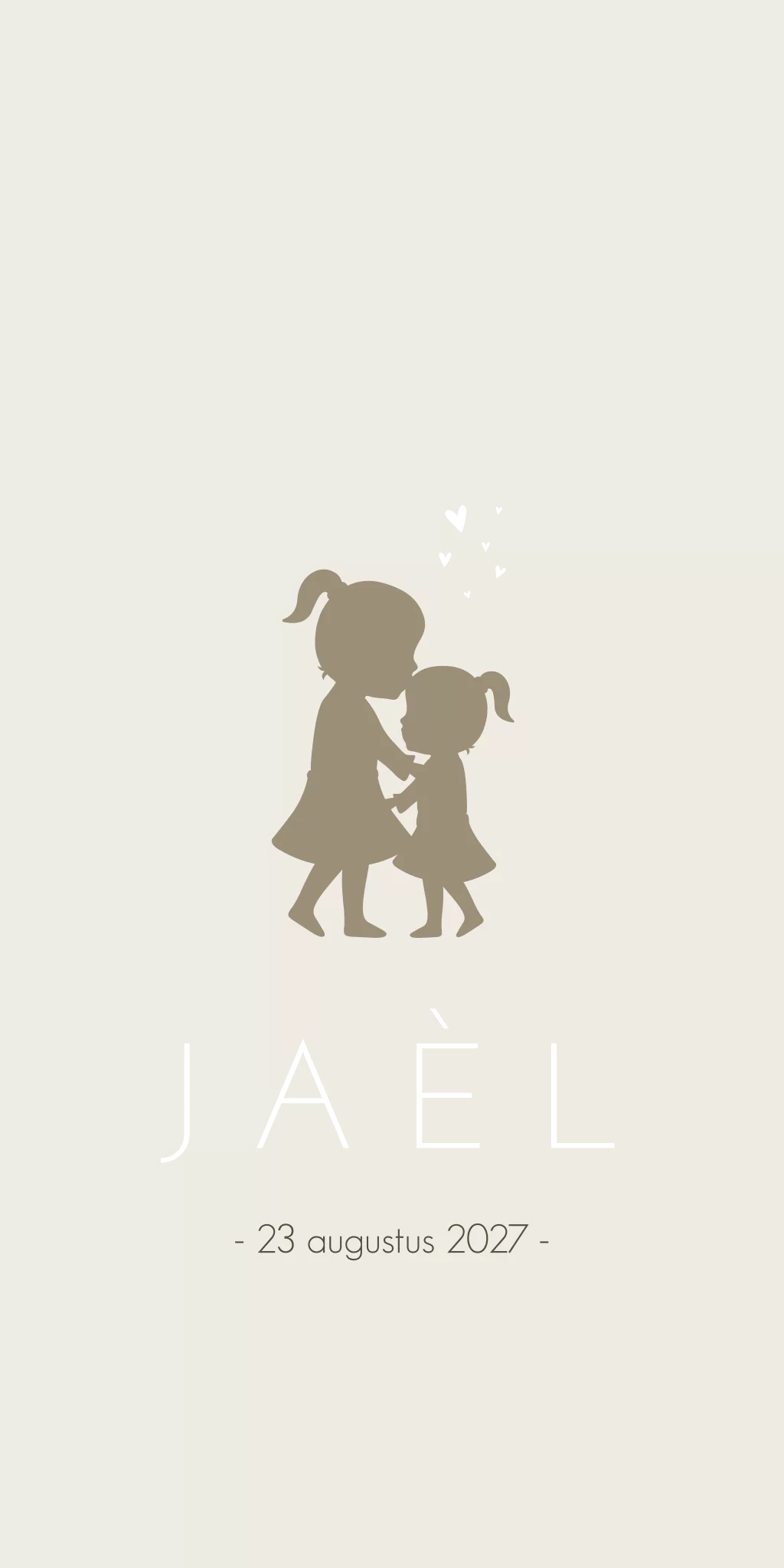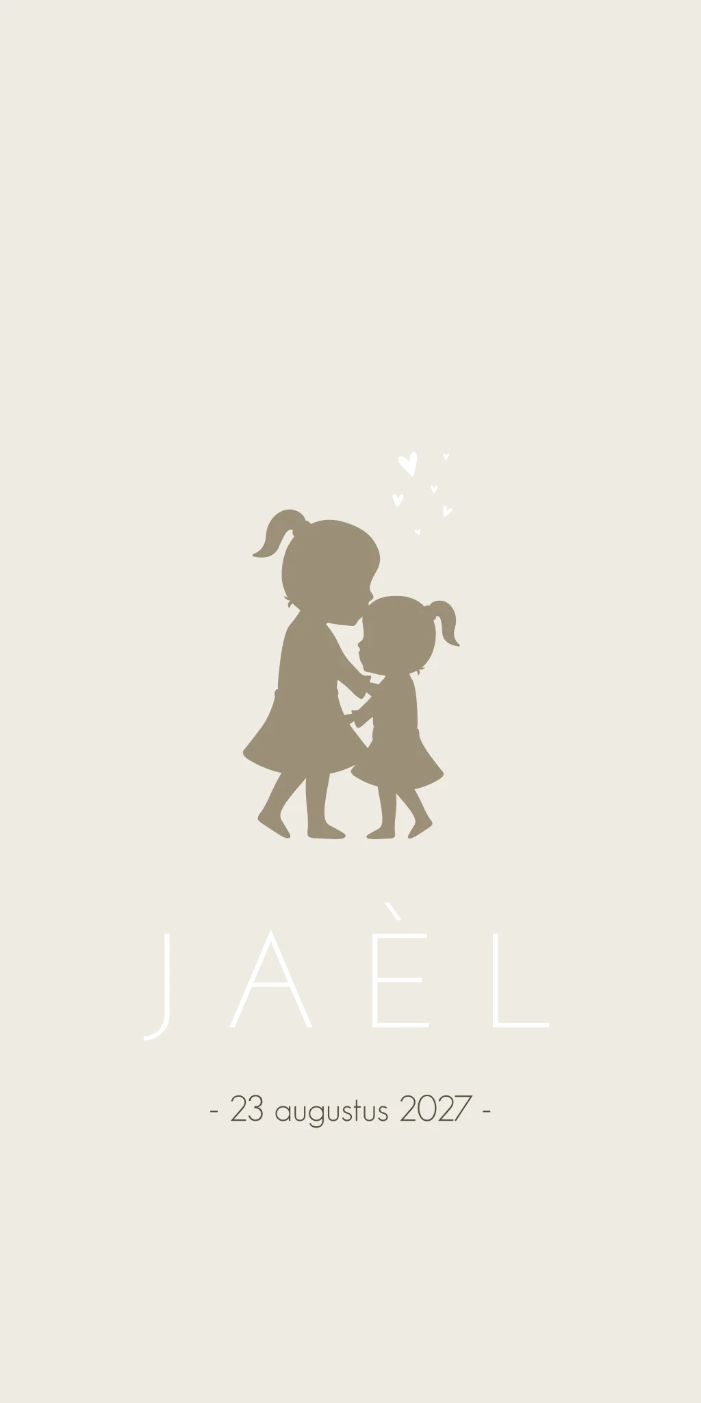 Super strak beige/ crème geboortekaartje Jaèl met een silhouet tekening van een zus die haar kleine zusje een kusje geeft. Omdat ze zoveel van haar kleine broertje houdt vliegen de vonken in hartjes vorm er vanaf!