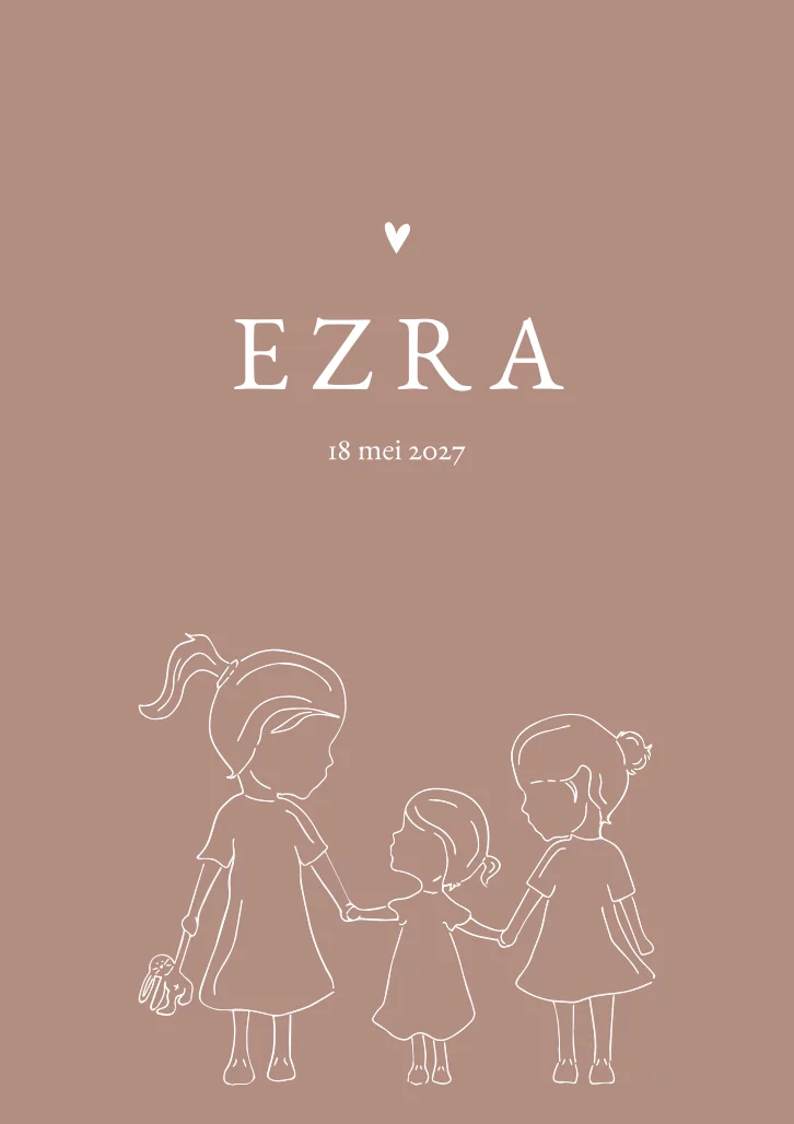 Een enorm schattig en hip geboortekaartje van 3 zusjes in een lijntekening. Kaartje Ezra is een oudroze kaartje. Wil je liever een andere illustratie? In onze beeldbank staan allerlei mogelijkheden! Mis je toch iets? Neem dan gerust contact met ons op.