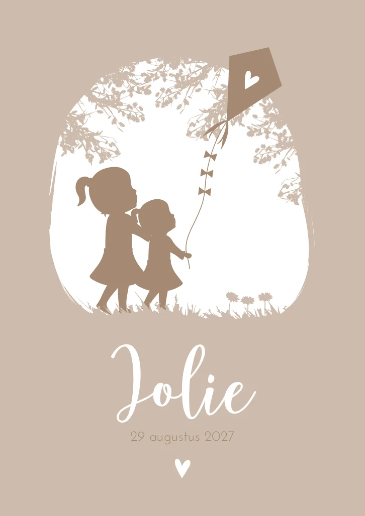 Een ontzettend lief kaartje voor ieder nieuw wonder! Kaartje Jolie is een zacht oud roze/ beige kaartje met een illustratie van twee zusjes die spelen met een vlieger. Wil je liever een andere illustratie op de kaart? Neem dan een kijkje in onze editor voor alle opties. Mis je iets? Neem dan gerust contact met ons op!