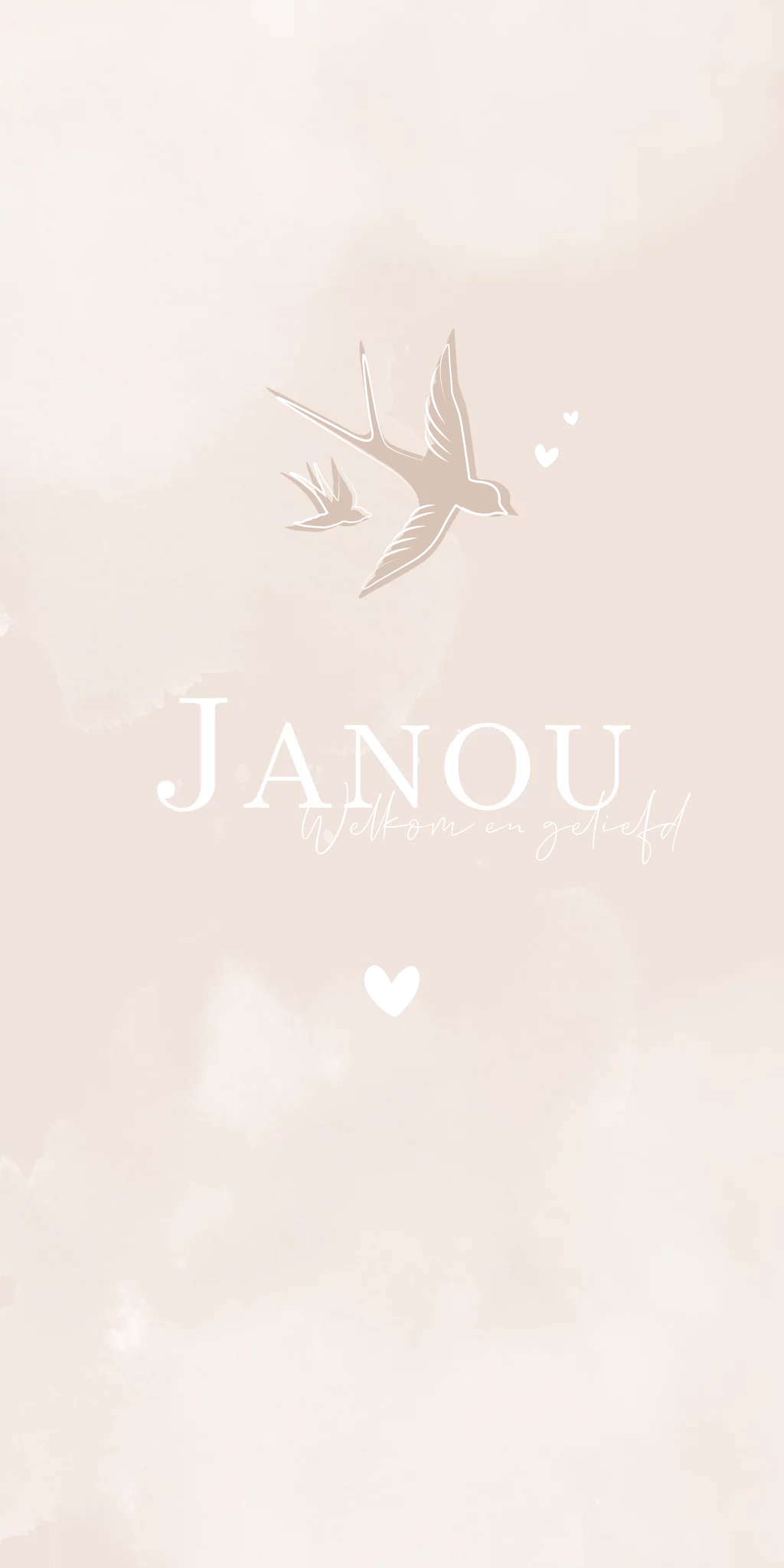 Een trendy geboortekaartje in beige/ licht roze naturel kleur met goudfolie lijntekening van zwaluw vogeltjes en kleine hartjes. De vogels vliegen in de wolken. Babykaartje Janou kun je eenvoudig aanpassen van kleur en/of opmaak.