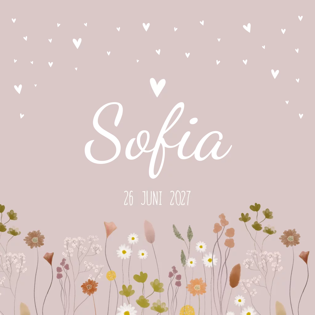Sierlijk, stijlvol en hip geboortekaartje Sofia voor een meisje, vol met allerlei soorten bloemen in diverse kleuren. De kaart is afgewerkt met roséfolie als accent, wat prachtig staat bij dit ontwerp. Wil je dit kaartje aanpassen in onze editor? Maak dan je eigen account aan en sla je verschillende versies op.