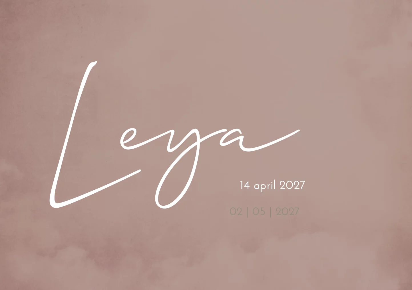 Lief zacht geboortekaartje Leya met wolk effect in oudroze kleur met de naam groot in witte letters. De achterzijde van dit geboortekaartje is volledig wit met roze letters. Wil je het kaartje liever in een andere trendy kleur die past bij de stijl van de babykamer? Pas dit ontwerp dan helemaal naar je eigen smaak aan in onze editor!