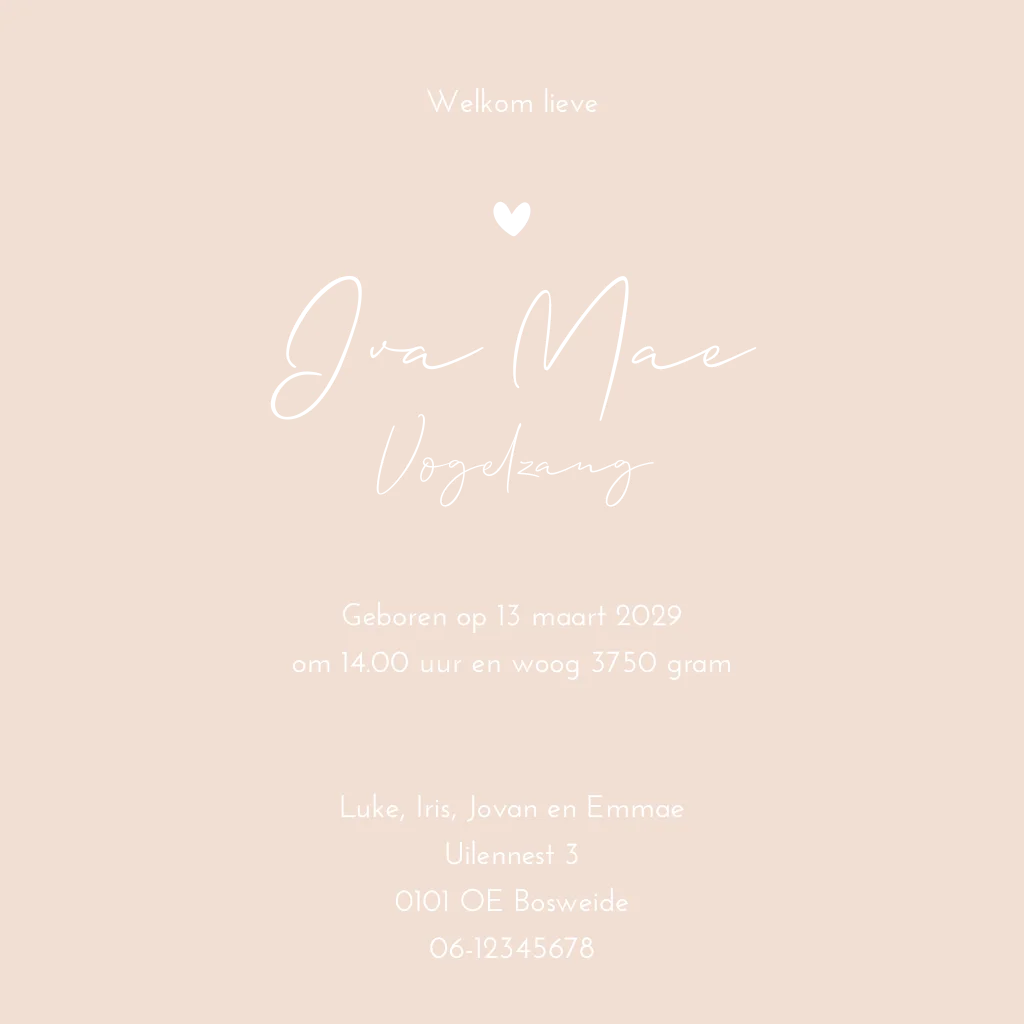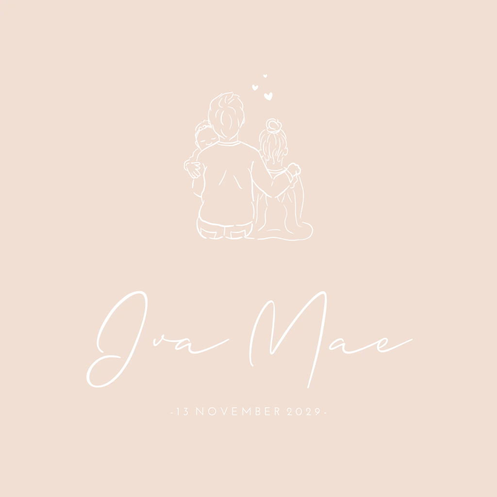 Een geboortekaartje in zachtroze / peach kleur. Op het kaartje Iva Mae is een lijntekening te zien van grote broer en zus met een kleine zusje op de arm. Daarboven staan enkele hartjes. De lijntekening is gemakkelijk te vervangen voor een illustratie in een andere gezinssamenstelling.
