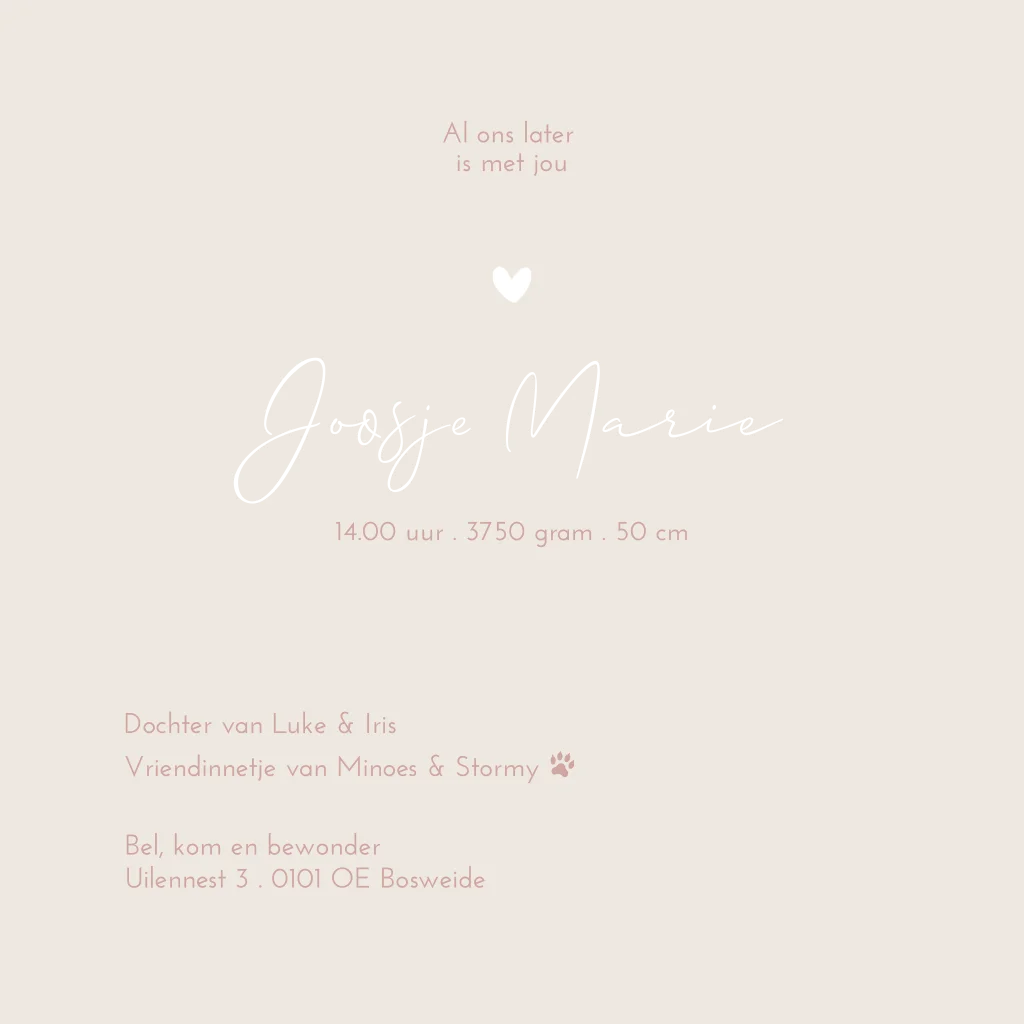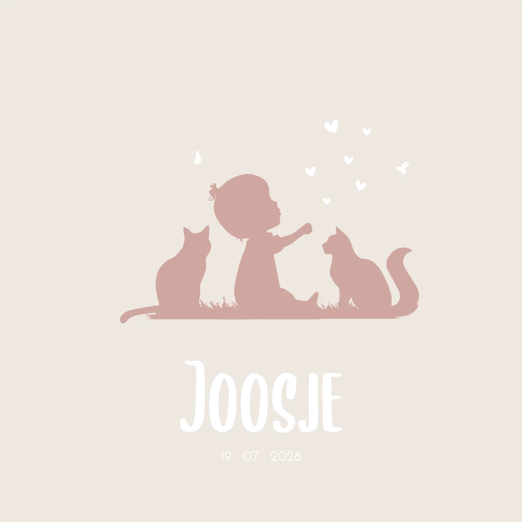 Een zacht en lief beige/ crème babykaartje Joosje met een roze illustratie tekening van 2 katten/ poezen en een meisje in het midden. De poesjes zijn zijn vriendjes. Om hem heen vliegt een bij en een vlindertje. Pas de illustraties aan naar jouw wensen of gezinssituatie.