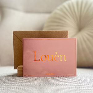 Stijlvolle roze gewolkte kaart met een koperen randje. Kaart Safae Lorin is makkelijk aanpasbaar in onze editor, zodat het geheel past bij de stijl van jouw babykamer.