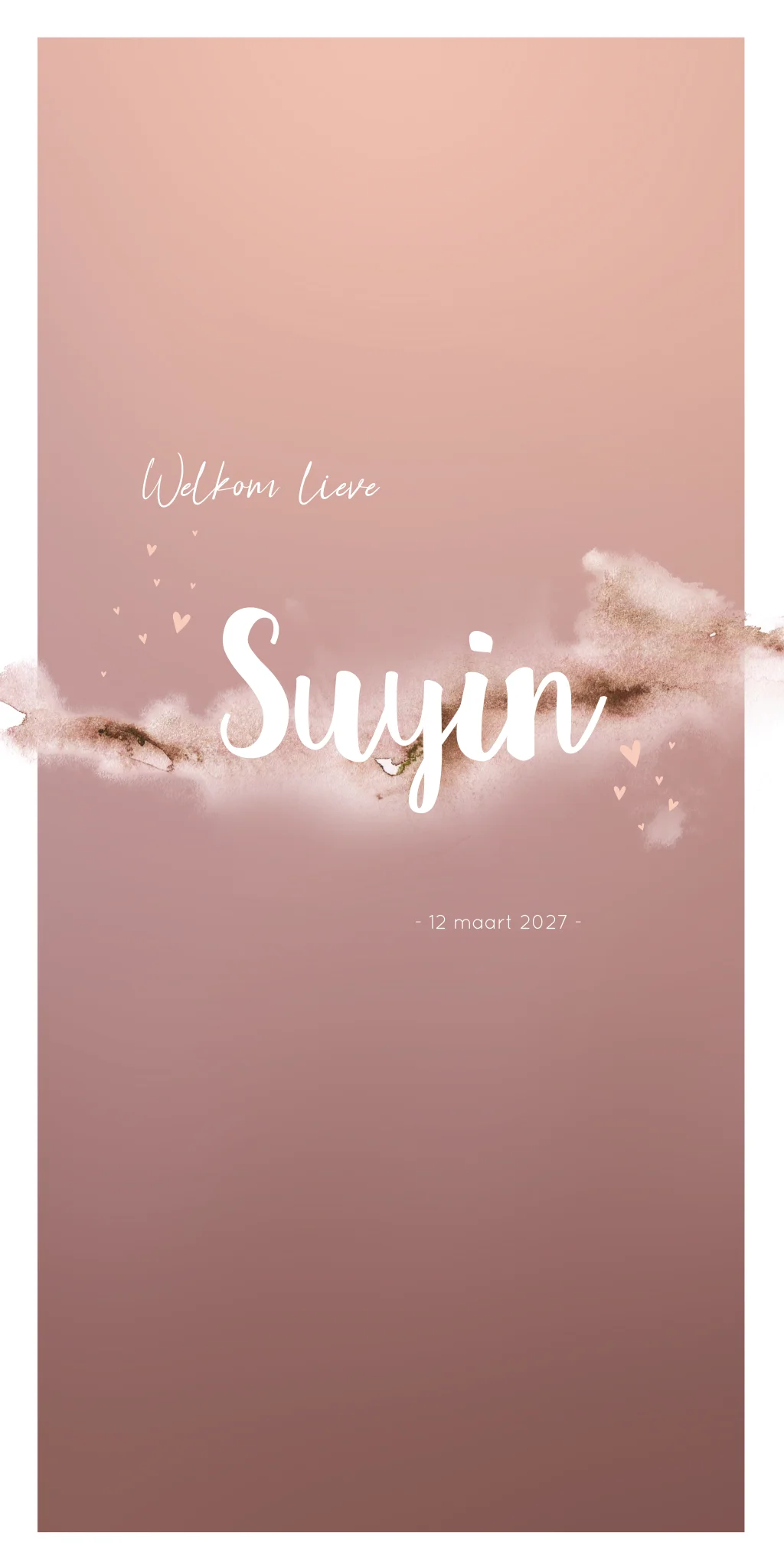 Een romantisch geboortekaartje met een roze achtergrond met een overloop van licht naar donker. Op kaartje Suyin staat op de voorzijde een waterverf vlek over de gehele breedte. Kaartje Suyin heeft een witte omranding.