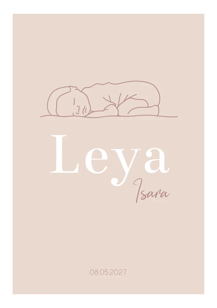 Het geboortekaartje Leya heeft een liefelijke uitstraling. Op het geboortekaartje is een illustratie van een baby te zien en wat hartjes. Maak het kaartje helemaal naar smaak in de editor.