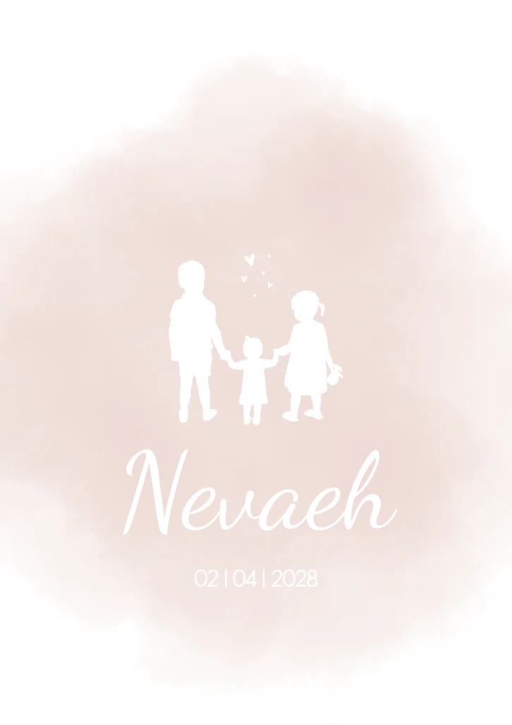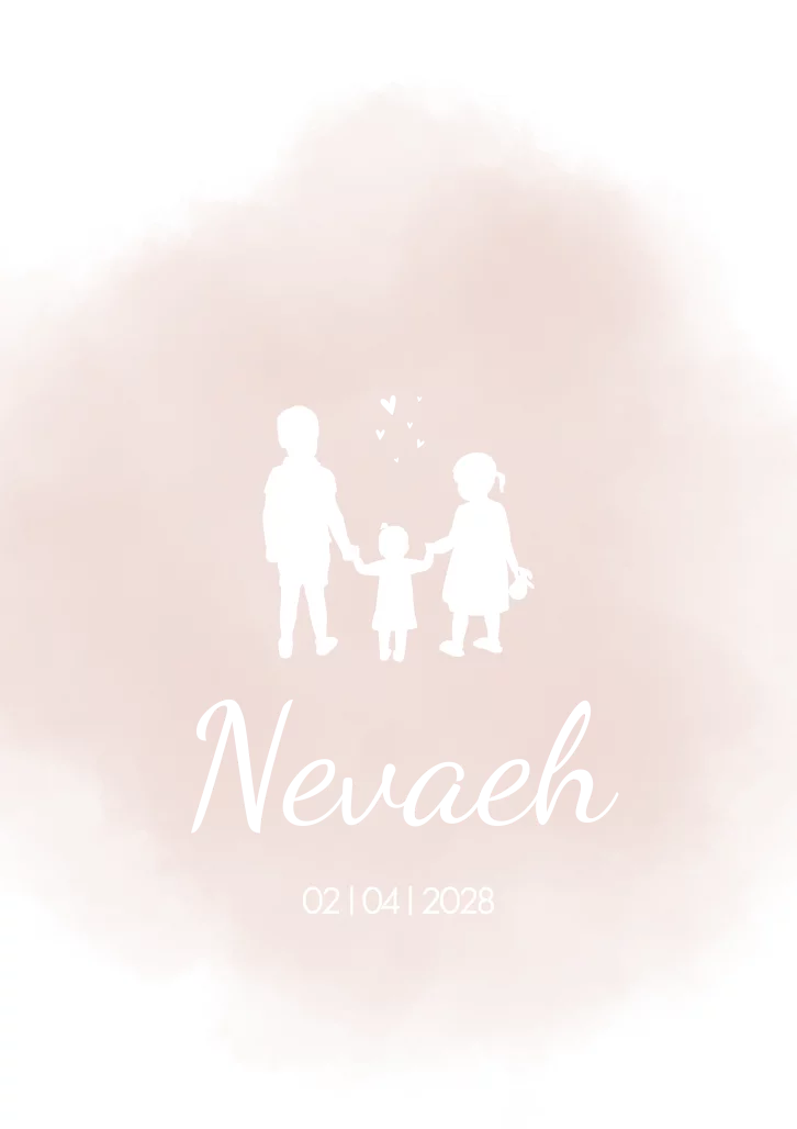 Stijlvol en luxe geboorte kaartje voor een meisje. Het silhouet is een gezinsportret van de kindjes, grote broer en zus met hun kleine zusje aan de hand.