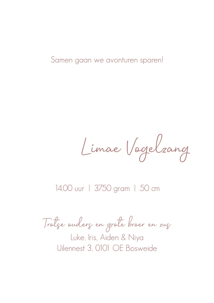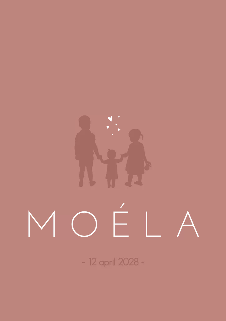 Stijlvol en warm roze gewolkt geboorte kaartje voor een jongen of meisje. De naam is in roséfolie gezet, deze kun je gemakkelijk zelf aanpassen naar een andere kleur. De babyfoto kun je vervangen met je eigen foto of verwijderen. Je past kaartje Moéla volledig zelf aan in onze editor!