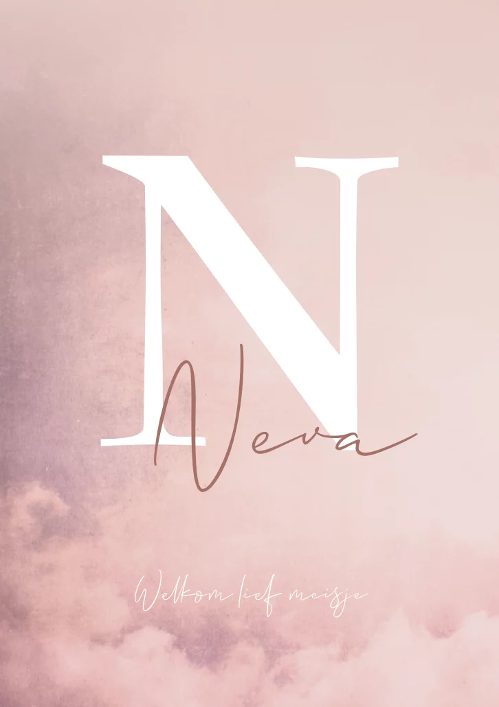 Een hip geboortekaartje met een gewolkte roze/paarse achtergrond. Op kaartje Neva staat een grote letter op de voorkant van de kaart. De naam staat in een geschreven sierlijk lettertype over de letter voor een romantische touch.
