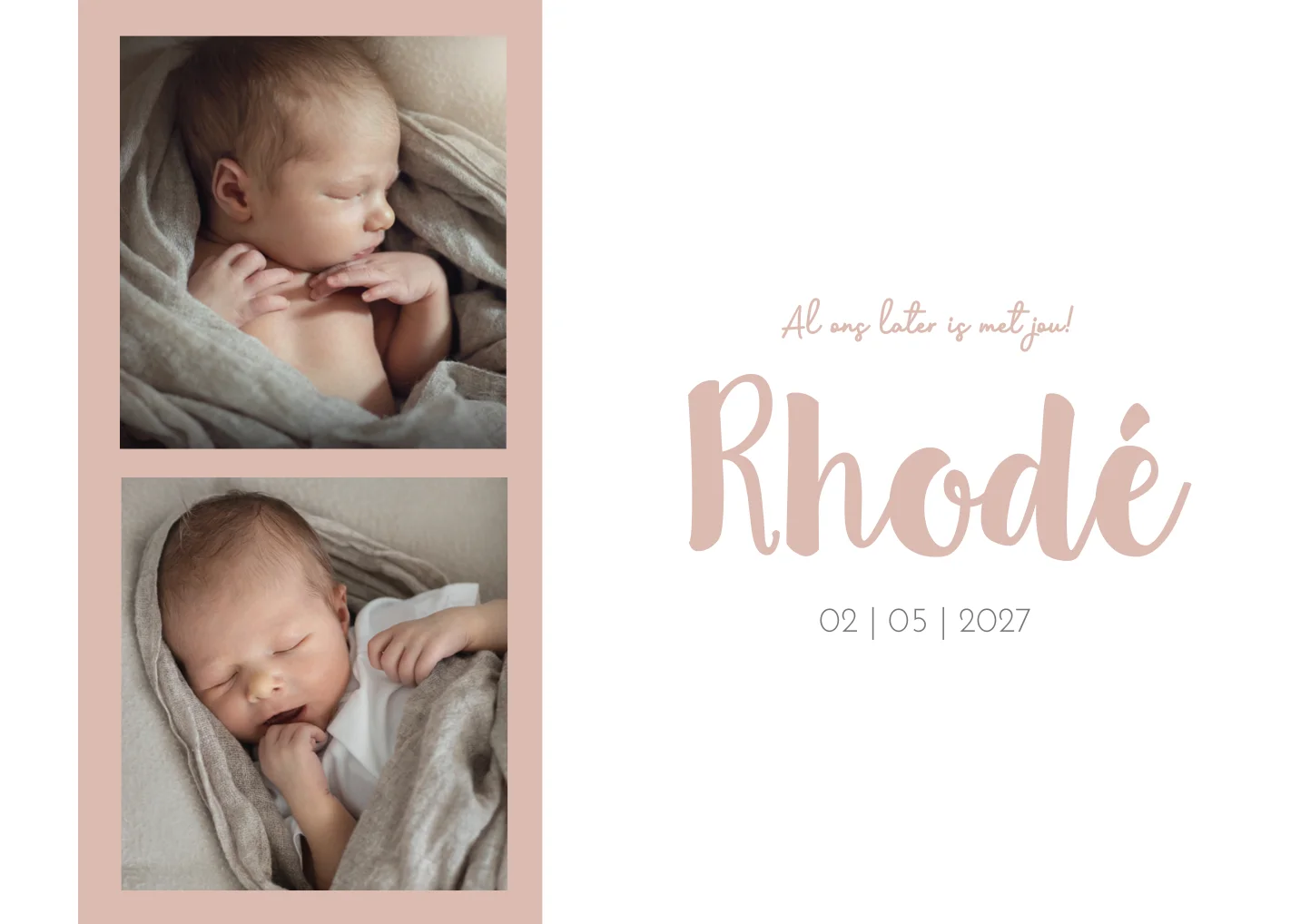 Strakke, stijlvolle witte fotokaart Rhodé Mae met roze accent kleur. Je kunt zelf 2 foto's van jouw kindje op de kaart plaatsen, maar je kunt er ook 1 plaatsen, net wat je zelf wilt of hoe het voor jou het beste uitkomt qua compositie. De foto's maken de kaart, dus let er wel goed op dat je de juiste belichting hebt bij het maken van de foto's. Tip: neem de foto's wat ruimer, je kunt ze altijd zelf nog bijsnijden naar het gewenste formaat. Wil je dat wij je foto's bewerken? Stuur ons dan een berichtje, wij zullen je dan zsm antwoorden zodat de kaartjes snel gedrukt kunnen worden.