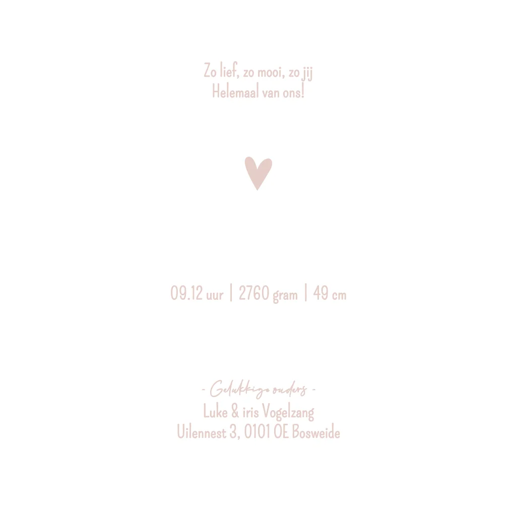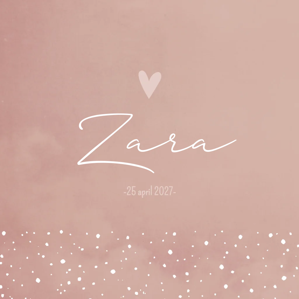 Lief gewolkt geboortekaartje met stipjes en hartje. De trendy oud roze kleur van geboortekaartje Zara is helemaal van deze tijd en prachtig in combinatie met koperfolie. Liever een ander lettertype? Pas de kaart eenvoudig aan in de editor.