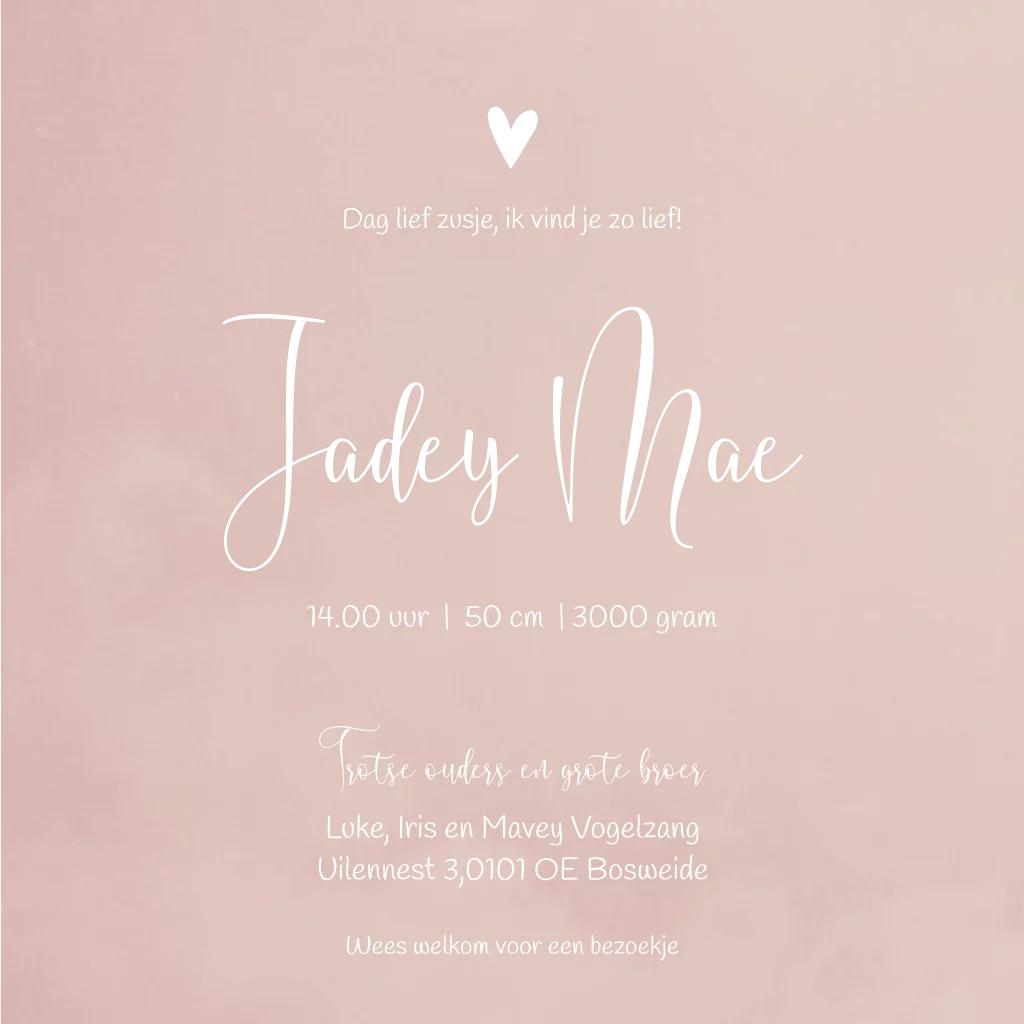 Super schattig geboortekaartje Jadey met een zacht roze gewolkte achtergrond. De hartjes, sterretjes en silhouet illustraties van de beide zusjes is in roséfolie afgebeeld. Je kunt dit helemaal eigen maken in de editor, de kleuren, de foliekleur, de illustraties en de lettertypes aanpassen!