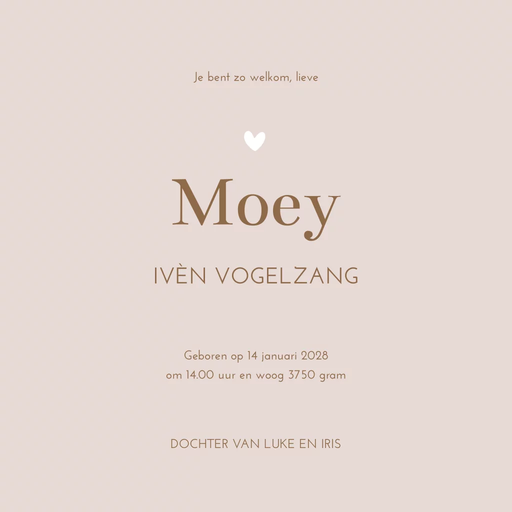 Stoer en tijdloos geboortekaartje Moey in zachtroze kleur met een waterverf illustratie van een teddybeertje en een groen takje en een wit hartje. De kaart is volledig aanpasbaar qua kleur, opmaak en tekst. Heb je onze gratis hulp erbij nodig? Mail of app ons dan even, dan helpen we je graag!