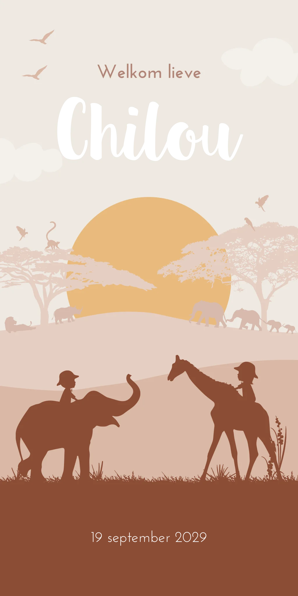 Een avontuurlijk geboortekaartje Chilou voor de wereldreizigers die graag de wereld ontdekken en op avontuur gaan. Het kaartje voor een baby bevat baobab bomen, olifanten, giraffen aapjes, leeuw, papegaaien en vogels. Dit tafereel speelt zich af in een Afrikaans landschap met een romantisch ondergaande zon. De broer en zus zijn samen heerlijk aan het spelen in de buitenlucht en rijden op een olifantje en giraffe. Deze kaart is extra mooi met koperfolie, maar het kan ook mooi zonder foliedruk of een andere kleur folie. Je past de kleuren eenvoudig aan in onze online editor.