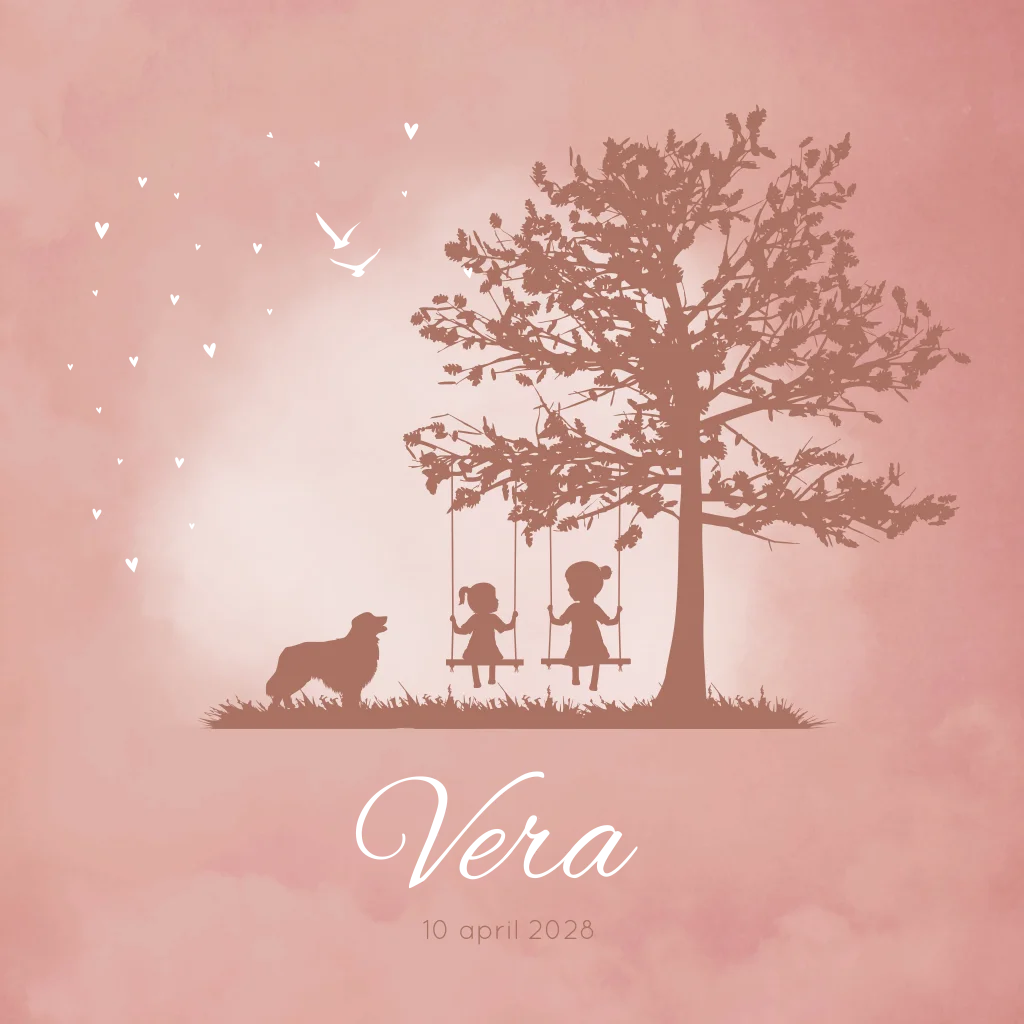 Een roze illustratief geboortekaartje Vera met een silhouet illustratie van twee zusjes die samen buiten in een boom aan het schommelen zijn. Hun hond kijkt toe. Ze worden omringt met hartjes en sterretjes en 2 vogels in koperfolie. Je past de silhouetten zelf aan en de hond kun je ook vervangen voor een ander dier zoals een konijntje of poesje