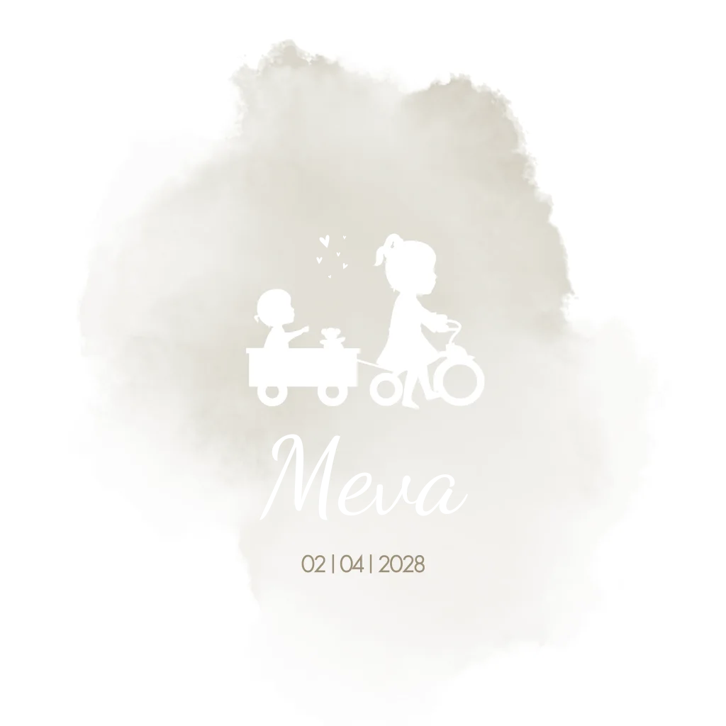 Een dromerig wit geboortekaartje met een beige wolk, waar een grote zus trots op haar fietsje fiets, met haar zusje achter in het karretje. De liefde spot er vanaf in de vorm van hartjes in koperfolie.
