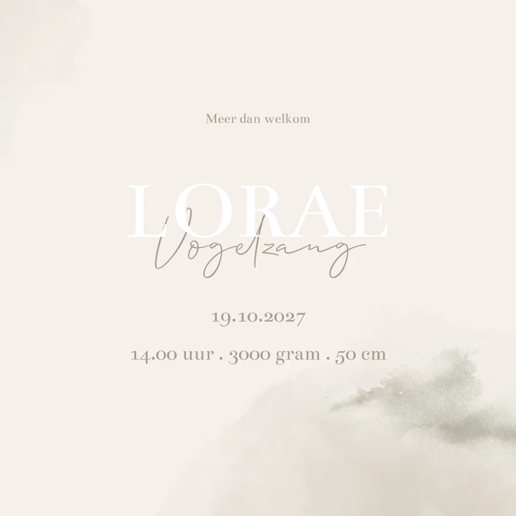 Stijlvol en tijdloos ontwerp voor een babykaartje in beige en crème natuurlijke tinten. De waterverf vormen maken het kaartje speels en hip. De naam Lorae is in roséfolie gezet. Dit kun je gemakkelijk zelf aanpassen in de online editor.