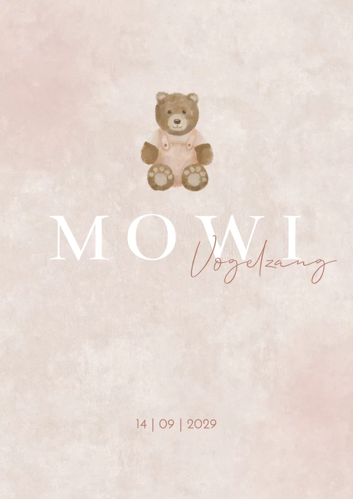 Een stijlvol en trendy hip geboortekaartje Mowi met een zacht roze siede/ velvet look achtergrond. Het teddy Beertje in watercolor maakt het kaartje speels en lief. De bruine letters kun je aanpassen naar hoe je het mooi vindt, zo ook het lettertype. Vraag gerust onze hulp als je het kaartje anders zou willen en je komt er zelf niet uit.