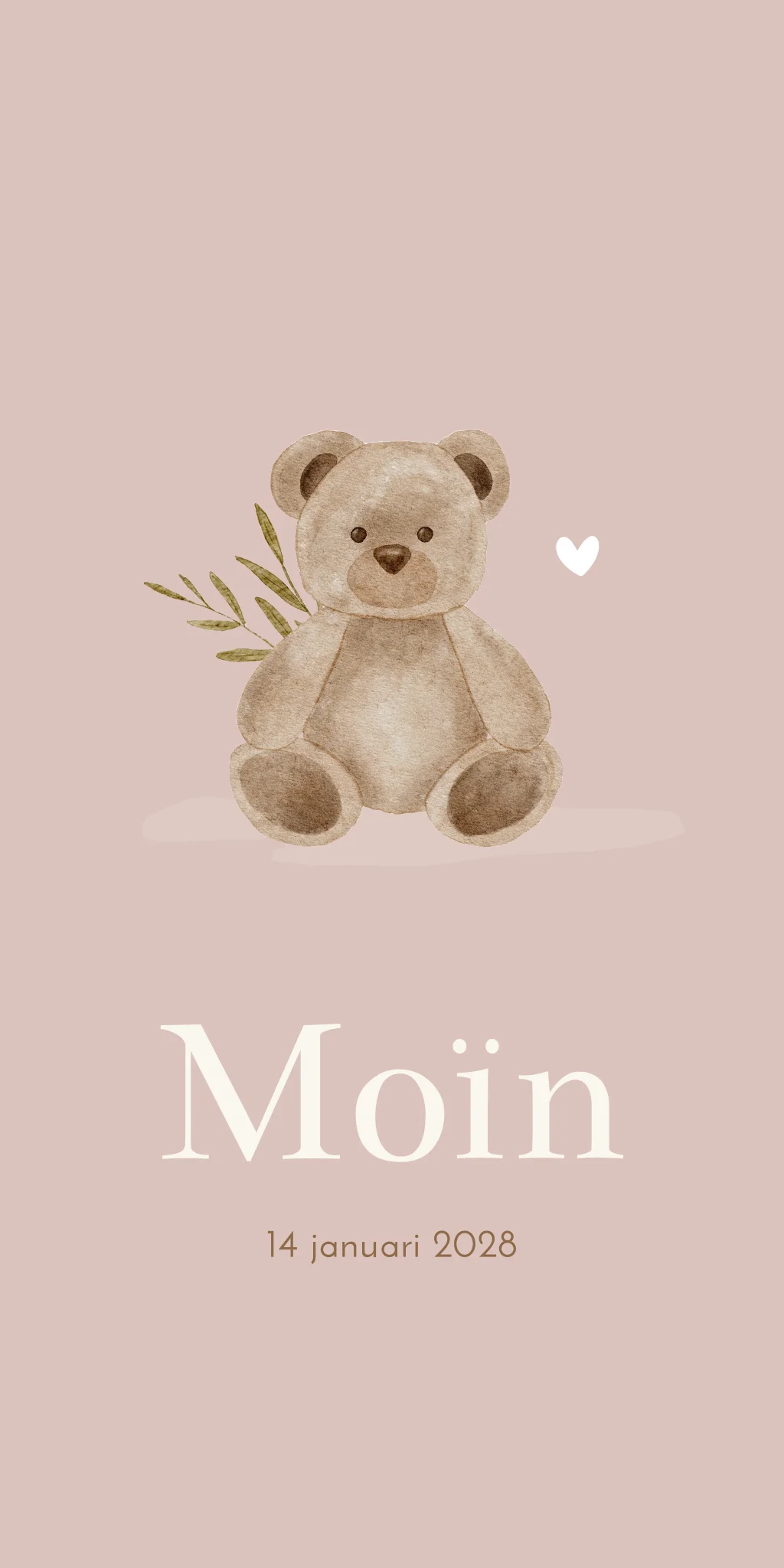 Hip en stijlvol geboortekaartje met een teddybeer in waterverf stijl. De kaart Moïn is in een oudroze tint, dit is allemaal aanpasbaar in onze online editor. De beer heeft een groen takje achter zich en een wit hartje.