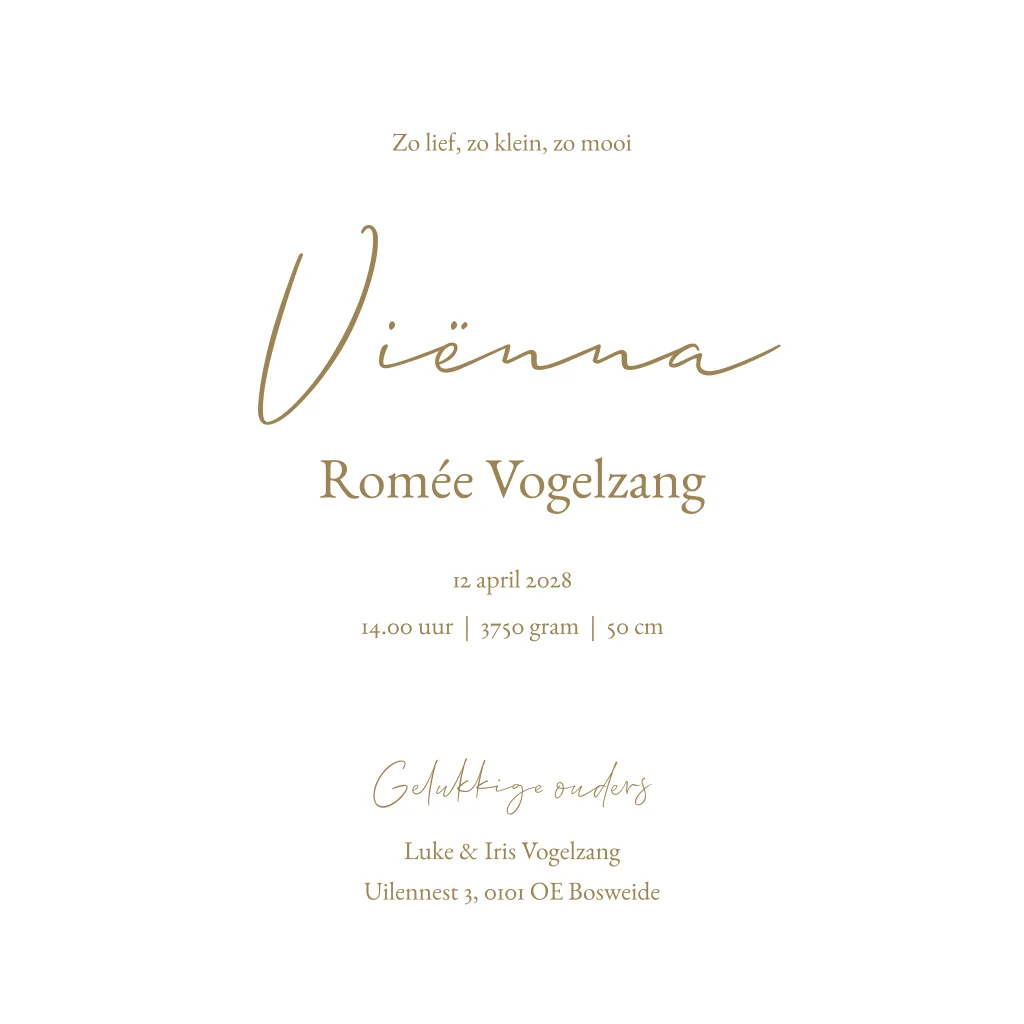 Een romantisch geboortekaartje met een waterverf/aquarel illustratie van een boeket met verschillende veldbloemen. Kaartje Viënna heeft een rustige uitstraling door het gebruik van één kleurenfamilie en wordt door het gebruik van klassieke lettertypes een tijdloos ontwerp. Wil je graag iets aanpassen? Neem dan een kijkje in de editor voor de vele opties!