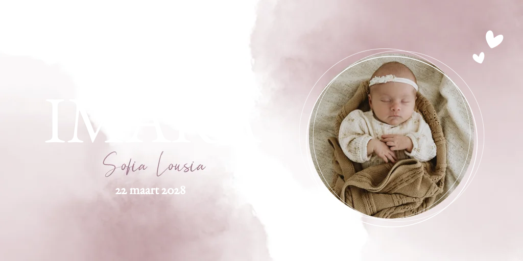 Romantisch gewolkt geboortekaartje Imara met waterverf vlekken in oudroze / lila kleur.
