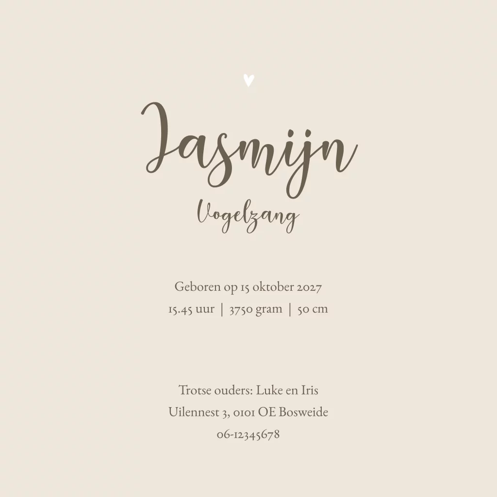 Een vrolijk geboortekaartje met een waterverf bloemenweide. Kaartje Jasmijn is herfstig bloemenkaartje door de warme oranje, bruine en roze tinten. Je kunt het kaartje gemakkelijk aanpassen in onze editor!