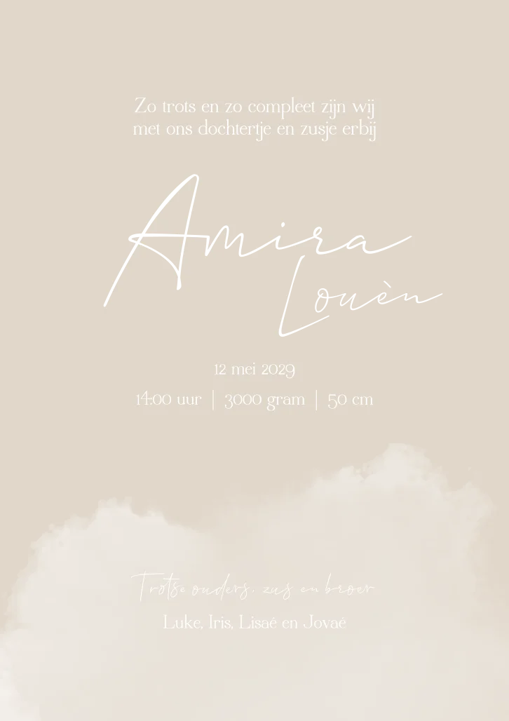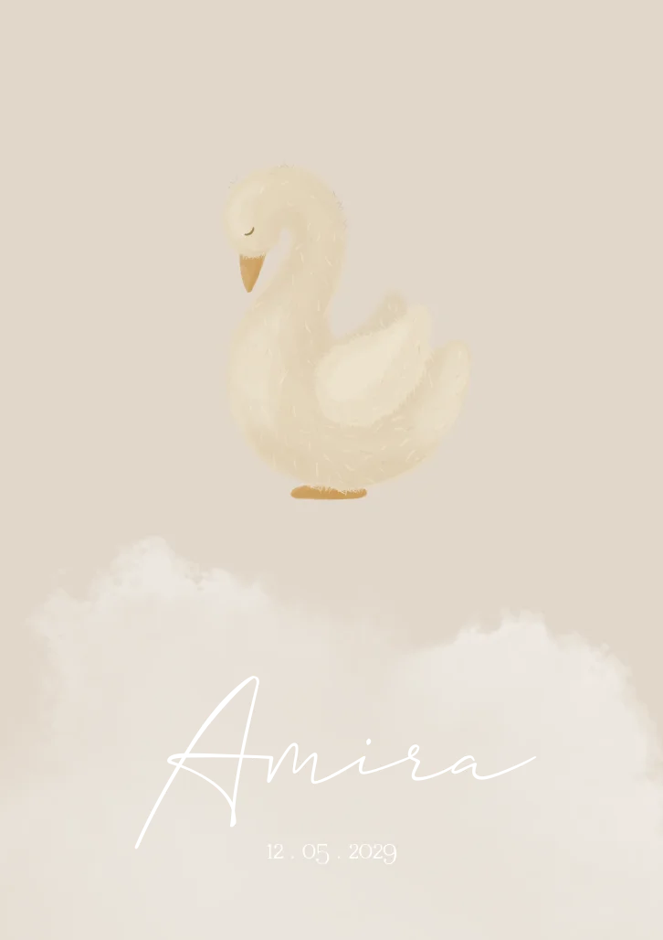 Zacht en neutraal beige/ crème geboortekaartje met een geïllustreerde zwaan/gans/vogel in neutrale en lichte kleuren. De namen zijn in goudfolie gezet, maar dit kun je eenvoudig aanpassen in onze online editor.