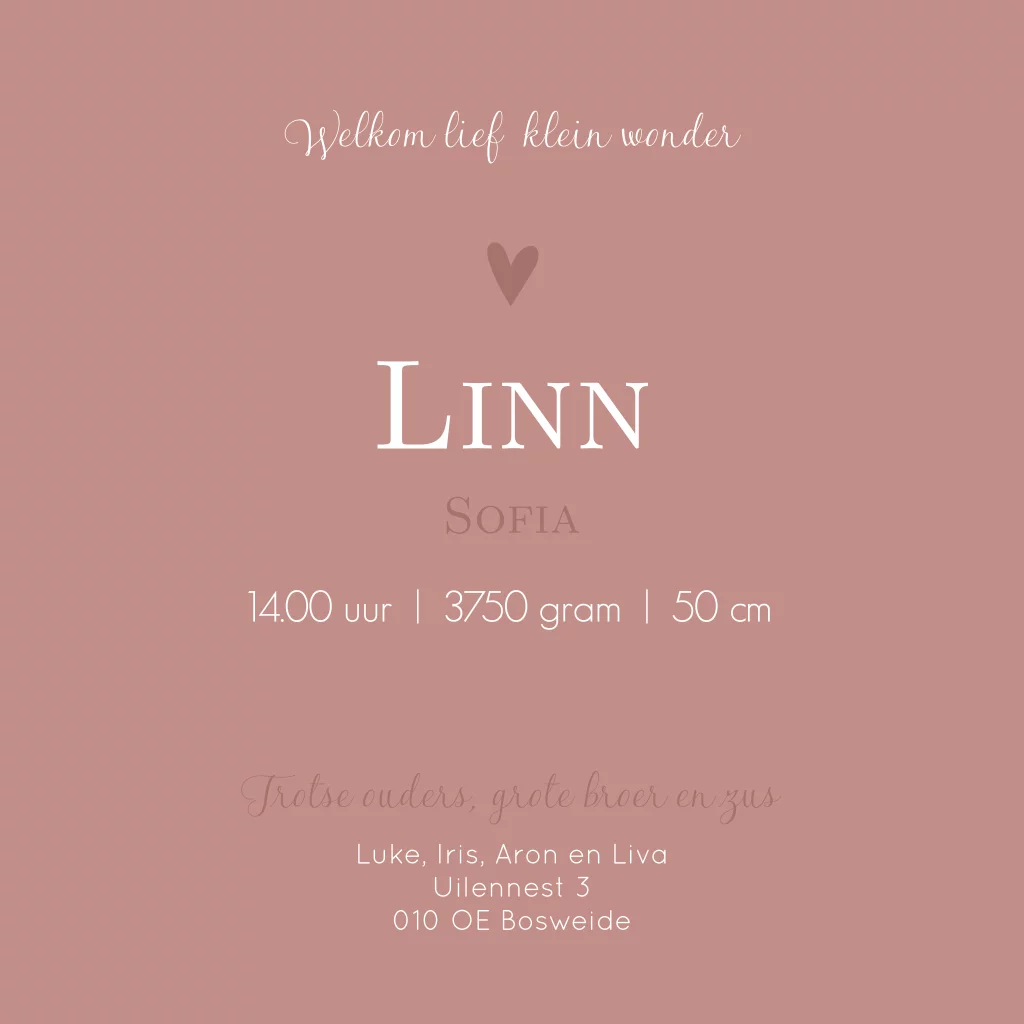 Een lila paars kleurig babykaartje Linn met paarse en roze tinten met een silhouet illustratie van een broer en zus die samen op een fiets aan het fietsen zijn en grote zus heeft een ballon in haar handje. De kat/ poes wil met ze spelen. Ze fietsen samen in de natuur. Er fladderen 2 vlinders en de liefde spat er vanaf in de vorm van hartjes. Je past de illustraties, opmaak en kleuren helemaal zelf aan in onze online editor!