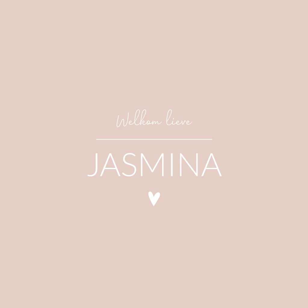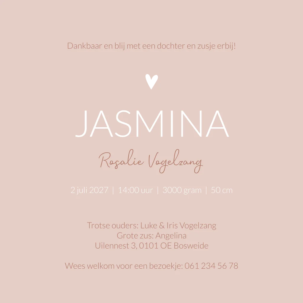 Eenvoudig en lief zacht roze geboortekaartje met koperen elementen. Aan de binnenkant van geboortekaart Jasmina staan twee zusjes die samen dansen. Je kan de illustratie eenvoudig zelf aanpassen in de editor. Heb je hulp nodig? Neem gerust contact met ons op!
