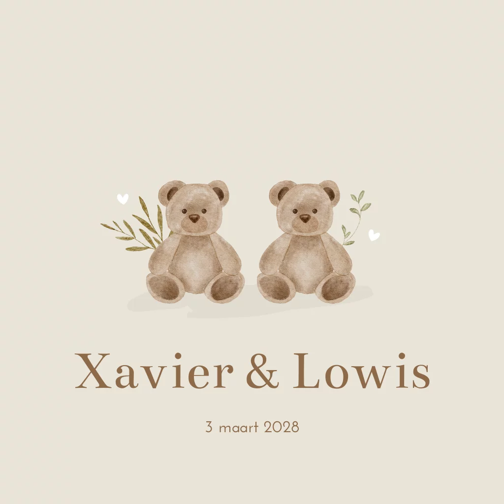 Stoer en tijdloos geboortekaartje Xavier & Lowis in beige crème kleur met een waterverf illustratie van twee teddybeertjes en groene takje en een wit hartje. De kaart is volledig aanpasbaar qua kleur, opmaak en tekst. Heb je onze gratis hulp erbij nodig? Mail of app ons dan even, dan helpen we je graag!