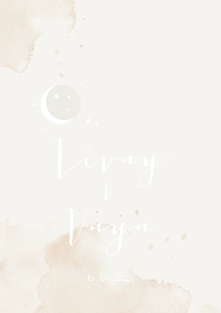 Trendy en hip geboortekaartje Lévay & Vaya met een beige aquarel achtergrond met vlekken en de naam in goudfolie. Het maantje en de sterretjes kun je ook met goudfolie laten bedrukken voor een groot wauw effect. Het papier voor foliedruk voelt zijdezacht aan en is aaibaar. Je past dit ontwerp volledig zelf aan in de editor.