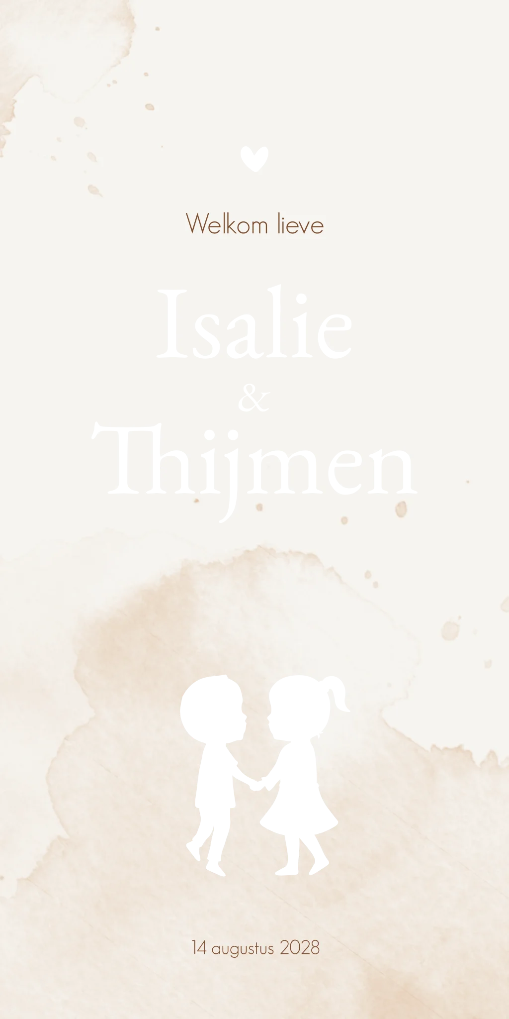 Een rustig beige/crème geboortekaartje met waterverf vlekken met een tweeling broer en zus die elkaar de hand vasthouden Tip! Laat tweelingkaartje Isalie & Thijmen drukken met koperfolie, dit geeft een heel mooi effect!