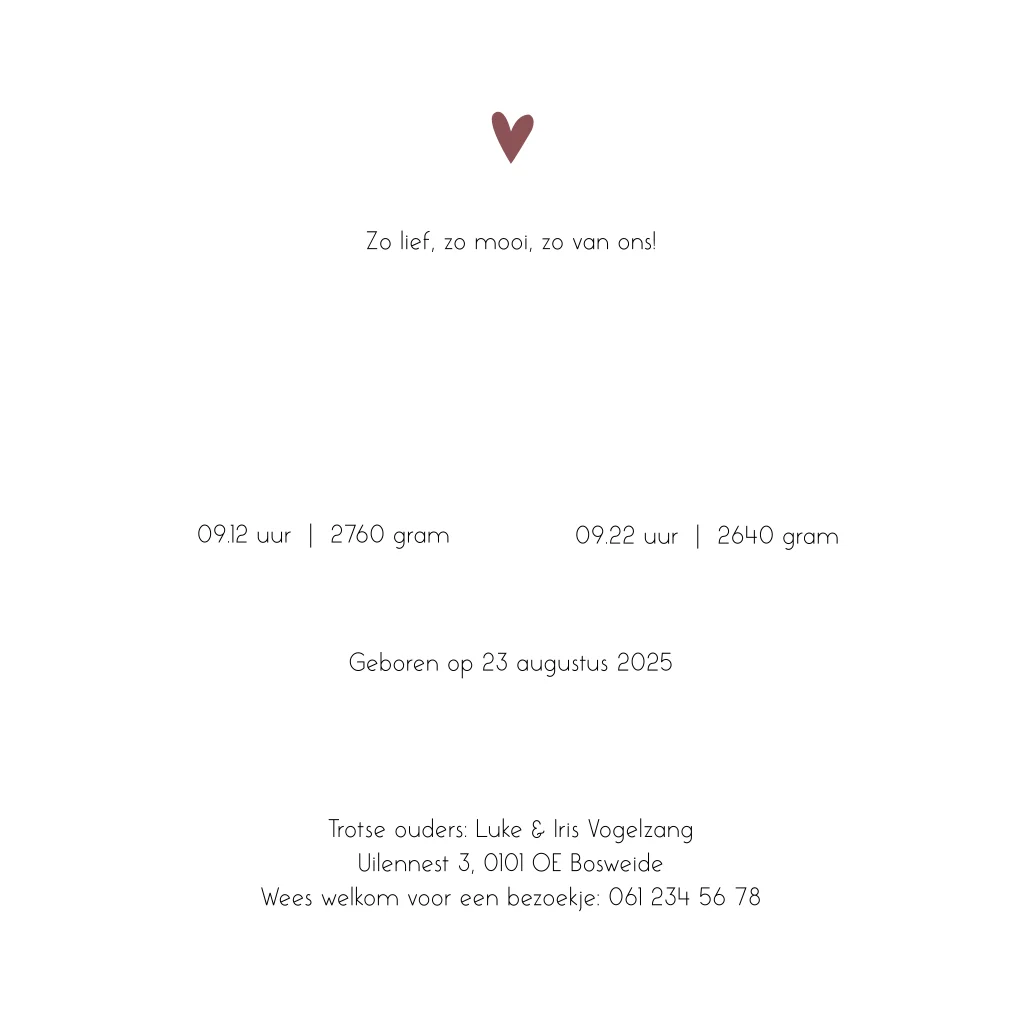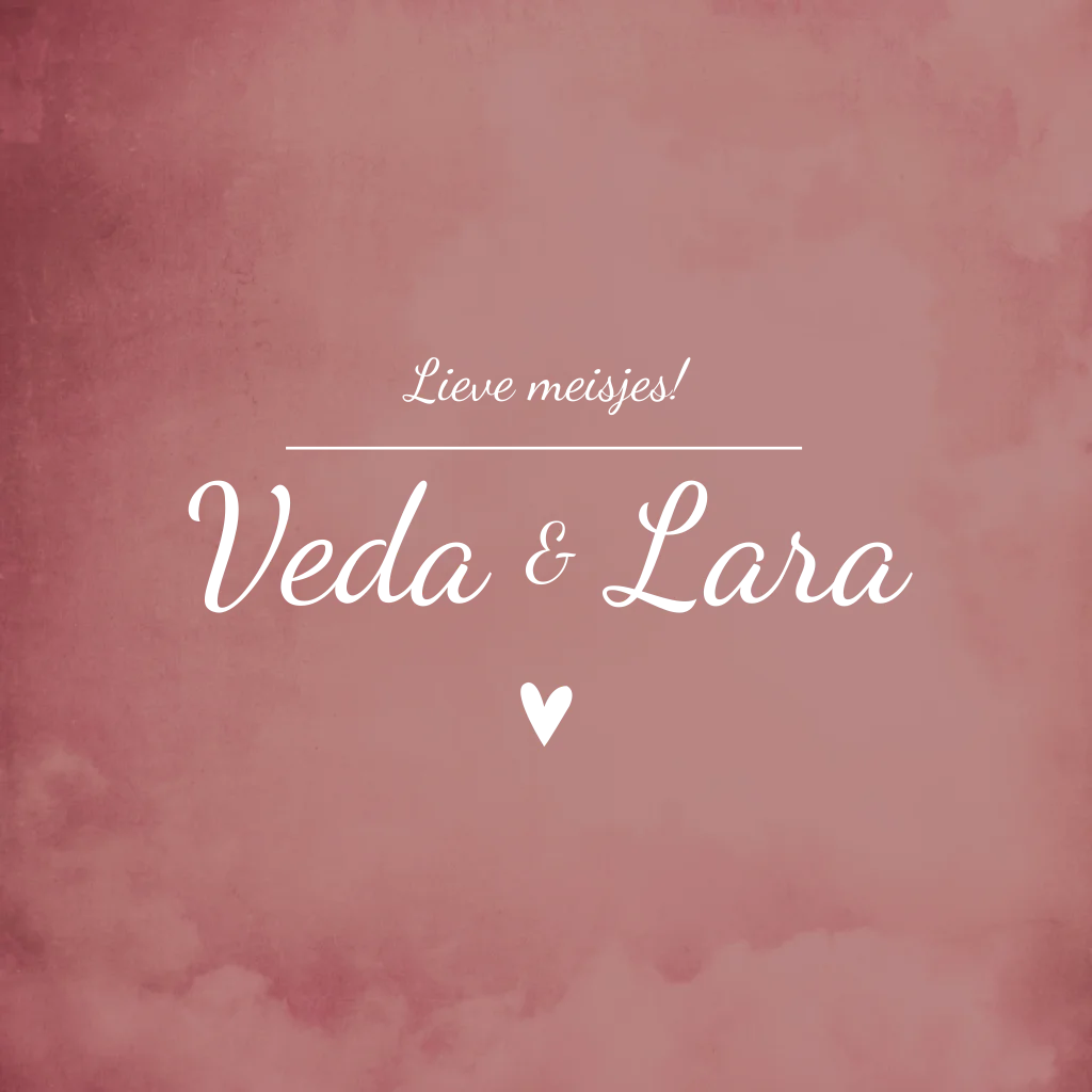 Roze gewolkt geboortekaartje voor een tweeling. De kaart bevat goudfolie tekst en elementen. Het kaartje Veda en Lara is naar wens aan te passen in de editor.