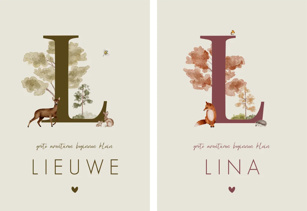 Lieve geboortekaartjes met een groot initiaal op de voorkant die wordt omringd door verschillende bosdieren in waterverf stijl. Ze kunnen zowel in zomer- als in herfststijl worden opgemaakt. De achtergrond is lichtbeige. Voor het meisjeskaartje is de letter donkerpaars en voor de jongenskaart donkergroen. Kaartje Lieuwe en Lina is een set. Zo heeft ieder kindje haar/zijn eigen kaartje. Maar als je de kaartjes naast elkaar legt, zijn ze weer samen één geheel.