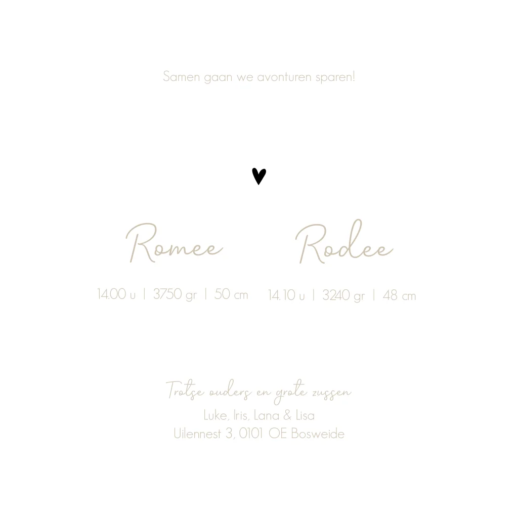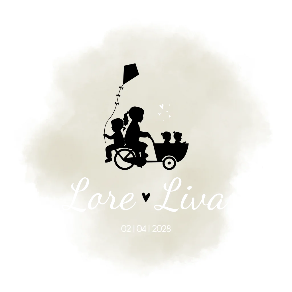 Een dromerig wit geboortekaartje Lore & Liva met een beige wolk, waar een grote zus op een bakfiets aan het fietsen is, met haar zusje achterop die een vlieger in haar hand heeft. Voorin de bakfiets zitten haar tweelingzusjes. De liefde spot er vanaf in de vorm van hartjes in goudfolie.