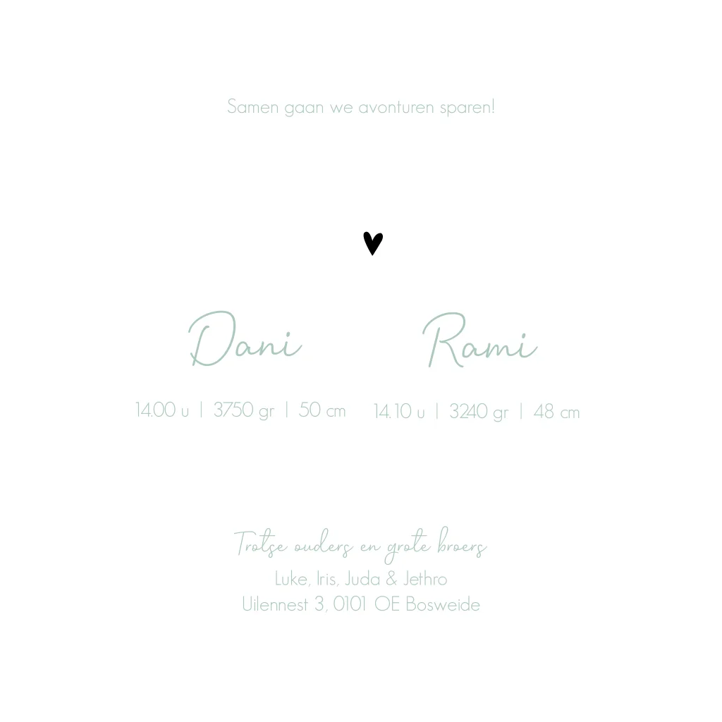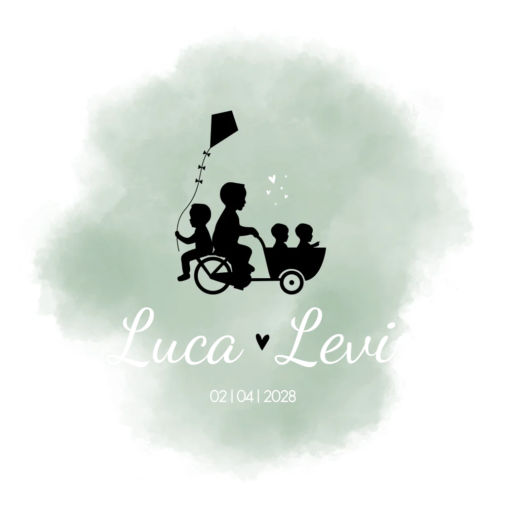 Een dromerig wit geboortekaartje Luca & Levi met een groene wolk, waar een grote broer op een bakfiets aan het fietsen is, met zijn broertje achterop die een vlieger in zijn hand heeft. Voorin de bakfiets zitten zijn tweelingbroertjes. De liefde spot er vanaf in de vorm van hartjes in goudfolie.