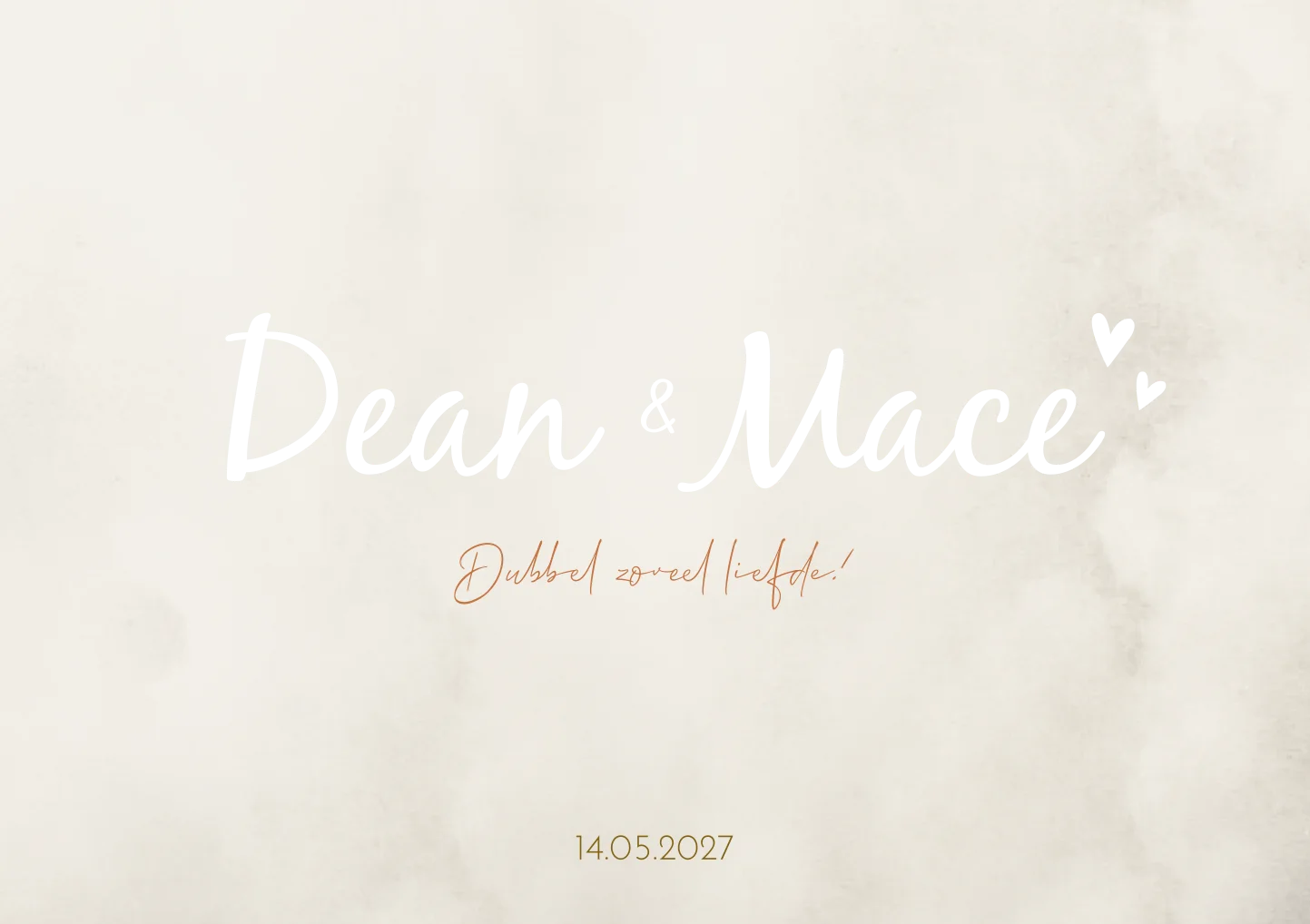 Een beige gewolkt geboortekaartje waarbij de namen en twee hartjes in koperfolie staan. Kaartje Dean en Mace is een simplistisch en stoer kaartje. Door de twee hartjes krijgt het kaartje een lieve touch. Aan de achterzijde van de kaart is ruimte voor de geboortegegevens en nog een mooi gedichtje.